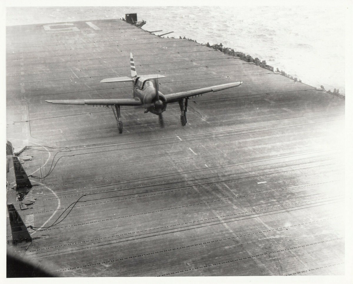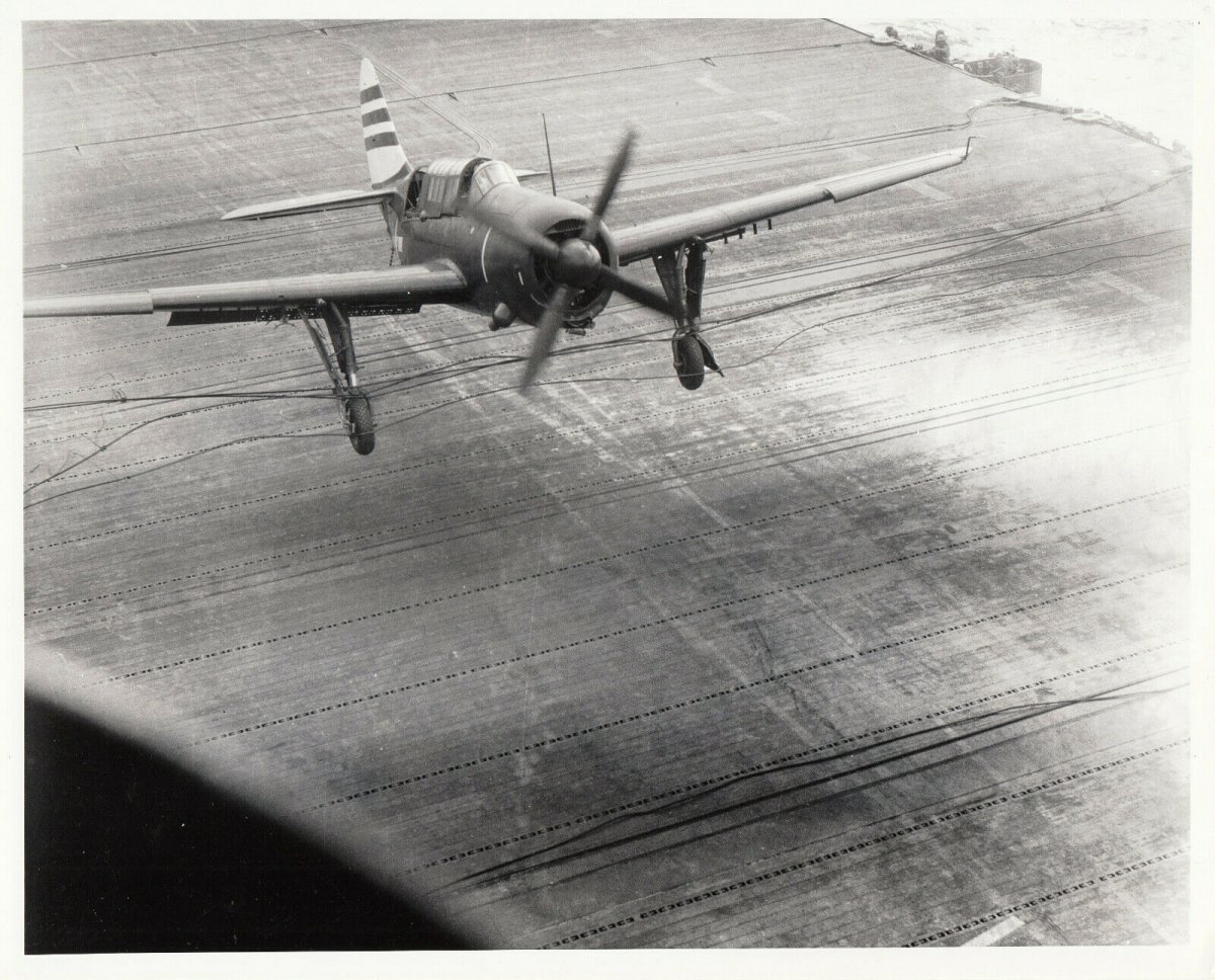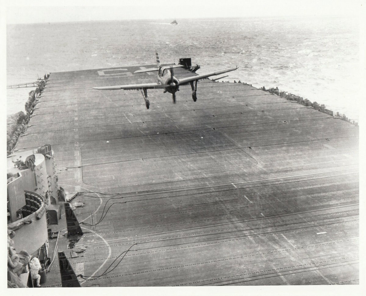 Curtiss SB2C Helldiver bomber crashing on the deck of USS Randolph aircraft carrier. Pencil caption on back reads, “2/17/45 Randolph - Cdr. Ralph Embree crashes SB2C on deck”. Cdr. Embree survived this crash but died three months later during raids in support of Okinawa Gunto operation, May 12, 1945. USS Randolph (CV/CVA/CVS-15) was one of 24 Essex-class aircraft carriers built during World War II for the United States Navy. Randolph was commissioned in October 1944, and served in several campaigns in the Pacific Theater of Operations, earning three battle stars.