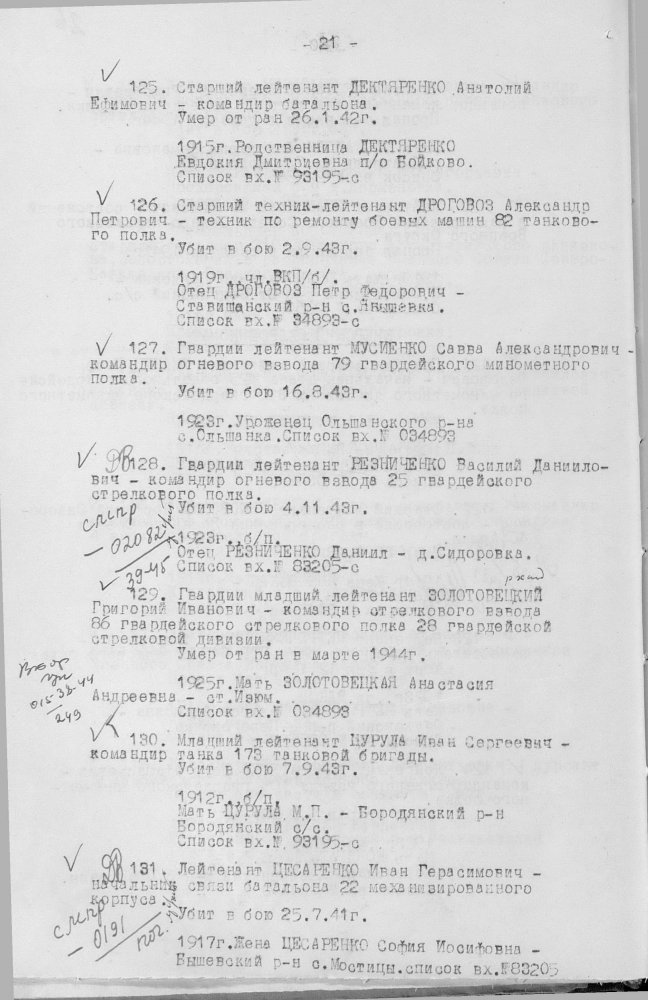 Обновленная информация по Цурулю И. С. (мать, дата перезахоронения, данные на вероятного брата, благодарности) ниже. Цуруль Иван Сергеевич В ходе поисковых мероприятий этого года в районе с. Пролетарское Змиевского района Харьковской области членами ВПО Ориентир были найдены останки бойца Красной Армии, уроженца Бородянского района Киевксой области Цуруля Ивана Сергеевича. Личность погибшего установлена по личному опознавательному знаку (смертному медальону), а останки были захоронены в 2-го ноября 2013 г. в братской могиле с. Пролетарское с воинскими почестями. Цуруль И. С. числится погибшим, однако место его захоронения до настоящего времени оставалось неизвестным. Мы ищем родных убитого для передачи им всей известной информации, смертного медальона и просим содействовать поискам. По информации местного военкомата, работники ЗАГС Бородянского района не нашли в архиве церковных книг, где было бы зарегистрировано рождение Цуруля И.С. Мать погибшего по данным ОБД Мемориал звали Цуруль М.П. В медальоне почти на 100 % читается ее имя и отчество – Мария Петровна. Очень возможно, что братом Ивана Сергеевича является Цуруль Петр Сергеевич (1914 года рождения), служивший офицером на Тихоокеанском флоте и выживший во время войны. Пожалуйста, если Вам что-либо известно о родных и близких таких людей: Цуруль Иван Сергеевич, 1912 года рождения, танкист, Цуруль Петр Сергеевич, 1914 года рождения, моряк, Цуруль Мария Петровна, мать Цуруля Ивана Сергеевича, ОТЗОВИТЕСЬ. Любую информацию по этому поводу направляйте таким людям: Бидулин Олег Анатольевич, председатель ВПО ориентир, депутат Змиевского райсовета Харьковской области zmiev1969@yandex.ru , тел. 050 6787450. Маковецкий Андрей (ОТЧЕСТВО), секретарь ВПО Ориентир orientir_zm@mail.ru. Колосов Максим Александрович, член ВПО Ориентир, kolosov@univer.kharkov.ua. Выражаем благодарность Виктории Нестратенко (Киев) и Александру Дударёнку (Минск). Приложения: скан медальона и его расшифровки (А. Дударенок ), данные из ОБД «Мемориал» на Цуруля И. С. и ОЭБД «Подвиг народа» на Цуруля П. С. Оригинал депонированного скана: http://us.ua/1317847/ , пароль – orientir.