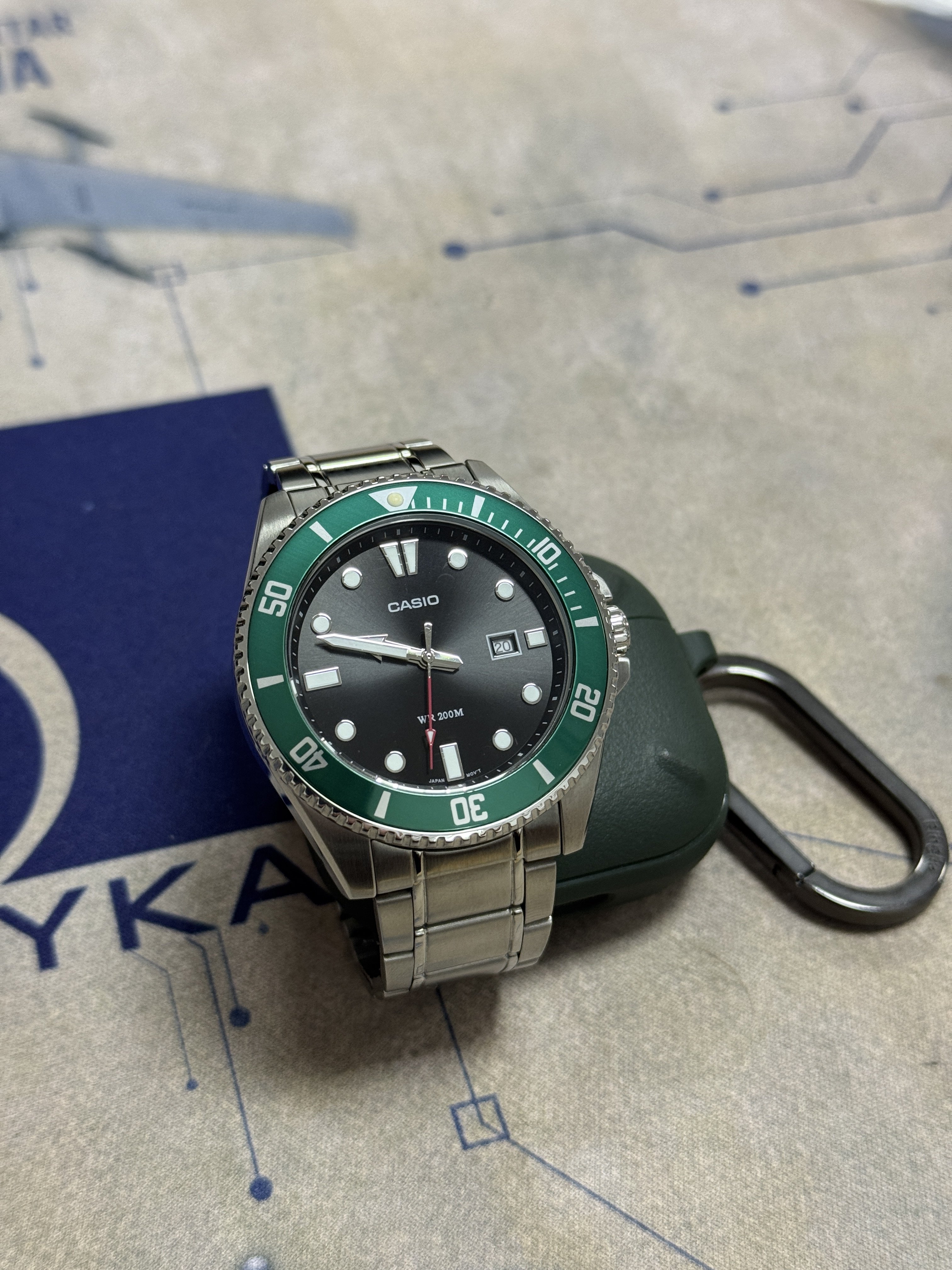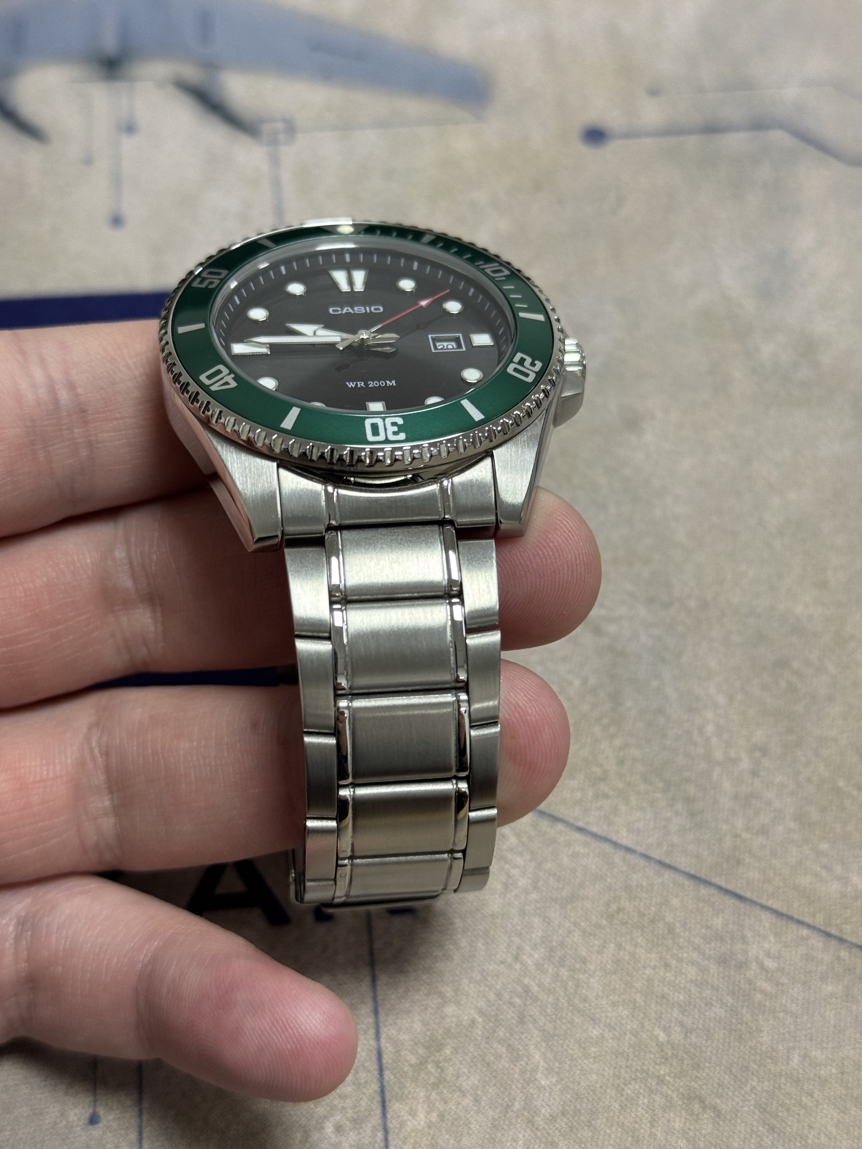 Продам годинник Casio MDV-107 Оригінал, повний комплект. Носився разів 10 дуже обережно. Стан прекрасний. Оновлена версія Casio Duro на металевому браслеті. Красивий зелений колір. На браслеті є декілька незначних потертостей, в місці де браслет зазвичай торкається стола (видно на фото). Основні характеристики: • Водонепроникність: 200 метрів (20 BAR) — підходить для плавання та занурення. • Корпус: Нержавіюча сталь. • Безель: Обертовий (односторонній), насиченого зеленого кольору. • Скло: Мінеральне, стійке до ударів. • Механізм: Надійний японський кварц. • Особливості: Закручувальна задня кришка та заводна головка. Бонусом віддам додатковий ремінець типу ZULU Strap зеленого кольору. Тільки продаж. Ціна: 3400₴