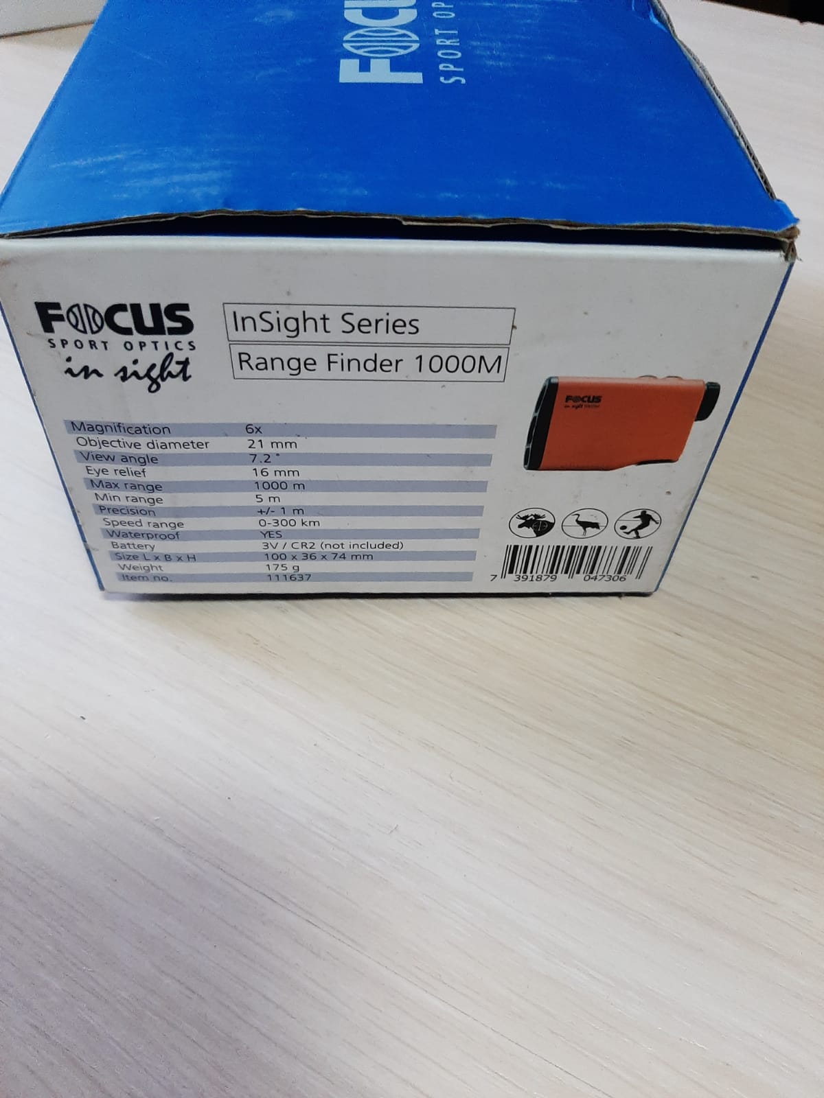 Focus In Sight Range Finder 1000 – це далекомір, який здатний вимірювати більші відстані порівняно з іншими пристроями серії In Sight. Завдяки цьому його можна використовувати на морі, у гольфі та на полі. Цей пристрій є високоякісним далекоміром, який використовує лазерну технологію, вимірюючи довжини від 4 до 1000 метрів із точністю вимірювання +/- 1 м. In Sight має дивовижну оптику з 6-кратним збільшенням, фокусною відстанню 21 мм і призмами BaK-4, які Разом із вдосконаленим багатошаровим антибліковим покриттям (FMC) вони дозволяють отримувати точне яскраве зображення навіть у складних умовах освітлення. Відстань від вихідної зіниці до окуляра становить 16 мм, що дозволяє використовувати обладнання навіть в окулярах. Конструкція: Антиблікове покриття лінз Призми БАК-4 Водостійкі Відносна яскравість [мм]: 12,25 Поле зору - кутове: 7,2 Поле зору - лінійне [м]: 126/1000 Збільшення: x6 Діаметр об'єктива [мм]: 21 Тип бінокля: Руф-призма Фокус від [м]: 5 Вихідна зіниця [мм]: 3,5 Додаткові функції: Корекція діоптрій Twist-up Бінокль з далекоміром: Так Вага [г]: 175 Відстань між зіницями [мм]: 16 Міжзінична відстань [мм]: Не застосовується Вихід на штатив: немає. Заправка газом: Ні . Колір: Чорно-помаранчевий Призначення: Для огляду місцевості Golf Hunting Nature Розміри [мм]: 74 x 100 x 36 Цена: 7500 торг.