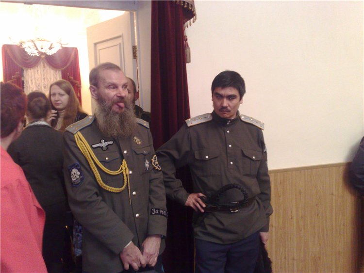 Что это за ряженое-казачье чудо???:eek: Еще и на "солидный" прием приперся ...