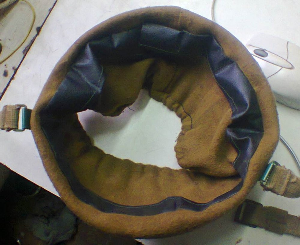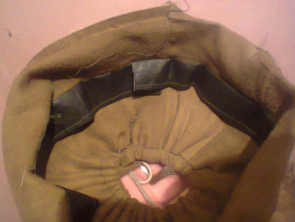Материал со старого бушлата внутрянка. Что то между хб и байкой. Размеры -делал на глаз по фото из сети, да бы не имел видеть оригинал. Грубо чулок 170-180мм по диаметруобруча с запасом в 1 см(на обгибы и тд. Дермонтиновая полоса-30мм, пришита от центра(там где веревкой стягивается) на 100мм. Может кто из комрадов истинные размеры выложит?