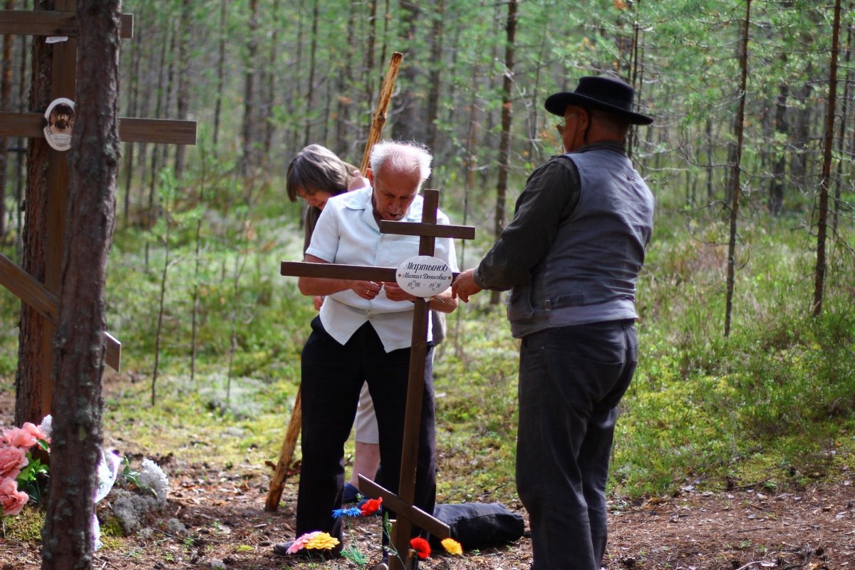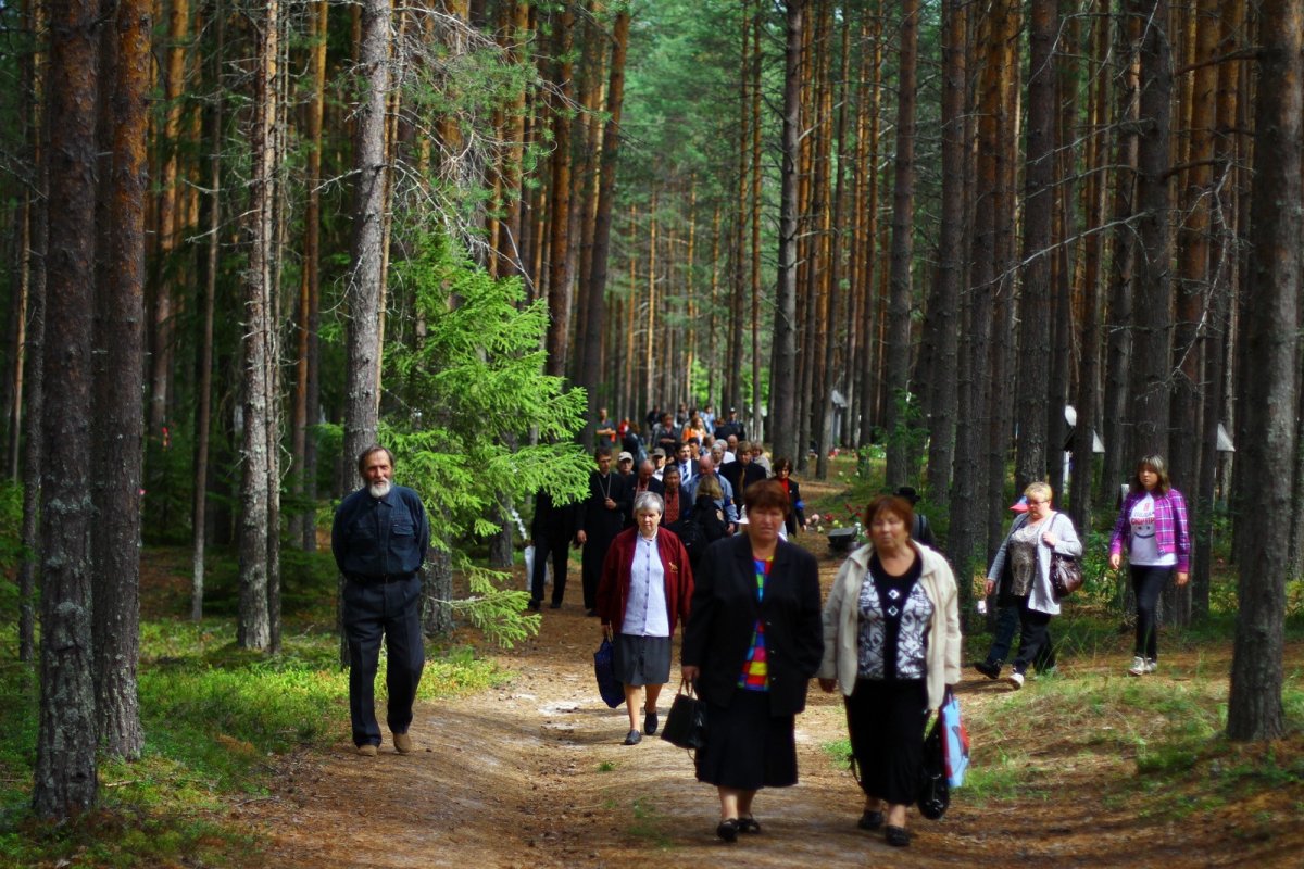 Часть 2. В 1997 году питерские мемориальцы Вениамин Иофе и Ирина Флиге позвали Дмитриева искать место расстрела первого соловецкого этапа. Это было очень сложно. Вокруг станции Медвежья Гора - везде тайга. Из показаний было известно только то, что машины с приговоренными проезжали через деревню Пиндуши, и значит, расстреливали где-то в окрестностях дороги, идущей на Повенец. По количеству рейсов за ночь и другим косвенным признакам мемориальцы поняли, что путь до места занимал около получаса, примерно 20 километров. Времена были другие - районная администрация помогала, чем могла, командование местной воинской части отрядило взвод солдат для поисков. - Мы со старшим лейтенантом бредём по лесной дорожке и я прикидываю: какое место бы выбрал? В одном из протоколов допроса я читал, как их инструктировали: не больше 10 км от места содержания заключённых, и так, чтобы не было слышно выстрелов и не видно света автомобильных фар, отсвета костров. Здесь? Нет, слишком близко к дороге. Вот там? Похоже, но лучше ещё пройти. Да, тут самое то… Только подумал, и стал замечать по сторонам дороги ямы правильной прямоугольной формы с просадкой в грунте. Оглянулись мы с офицером вокруг, а ям-то кругом немерено… Спойлер Лес, куда хватало глаза, был заполнен могилами. В первых же раскопах были обнаружены черепа с пулевыми отверстиями. По числу могил сразу стало понятно, что здесь был расстрелян не только тот соловецкий этап, а гораздо больше народу. Среди расстрелянных были люди, чьи учёные звания не умещались на одной странице машинописного текста, а список научных трудов были размером с ученическую тетрадь. Масса интеллигентов, белых солдат и офицеров и, конечно, священников - четверо из которых канонизированы РПЦ как святые. Всего порядка девяти тысяч человек. Это одна из самых больших братских могил сталинского террора - наряду с Левашовской пустошью, Бутовским полигоном, Коммунаркой, Куропатами и Катынью. Место это никак не называлось. Порывшись в старых картах, Дмитриев обнаружил, что рядом значилось урочище Сандармох. Так и решили назвать находку. На Севере тихо. Звуки - стук поезда, грохот сыплющихся с самосвала камней, гул машины на шоссе - разрывают тишину ненадолго. Сандармох - это три часа от Петрозаводска на поезде до станции Медвежья Гора, двадцать километров на автобусе, едущем в Повенец. Незаметный поворот, метров четыреста по лесной дорожке, там - небольшая поляна с остроконечным камнем и деревянной часовней, а дальше - просто лес, обычный карельский лес, корабельные сосны. А на каждой - портрет убитого здесь человека. Пахнет соснами, снег хрустит под ногами, синеют тени, дятел выдает дробь. И со всех деревьев на меня смотрят люди, черно-белые фотографии. Я иду по лесу, среди деревьев - и они повсюду, тысячи людей. Я начинаю их разглядывать. Каждая фотография - сообщение. За одно мгновение человек старается рассказать о себе, о том, что он за существо, и каково это, быть им. Люди фотографируются живыми, но будто под прицелом вечности. В этой жизни все эти люди стали деревьями. И каждое дерево рассказывает мне, каким человеком оно было. Спойлер Потерявшись, я долго брожу по лесу. Я выхожу обратно на поляну, где стоит большой камень, который двадцать лет назад поставили Дмитриев с его другом Гришей Салтупом. На нем надпись: "Люди, не убивайте друг друга!". Эт