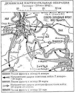 Я не пишу историю. Я даю ссылки на источники и краткие тезисы с этих ссылок: Демянская операция 1942, 7.1-20.5, войск Северо-Западного фронта (ген.-л. П.А.Курочкин). Цель-окружить и уничтожить немецкую группировку войск в районе Демянска. Наступая в условиях лесисто-болотистой местности при глубоком снежном покрове советские войска 25.2 завершили окружение 6 дивизий 16А. Ликвидация их затянулась из-за недостатка сил. Противнику удалось 23.4 прорвать фронт окружения и образовать т.н. рамушевский коридор. Дальнейшие попытки советских войск ликвидировать демьянскую группировку успеха не принесли. В ходе Д.о.противник понес значительные потери. Советские войска сковали крупную группировку войск, сорвали планы наступления противника на Осташков навстречу другой группировке, имевшей задачу наступать из района Ржева. Длительная борьба в районе Демьянска отличалась исключительным упорством и напряжением. Войскам правого крыла Северо-Западного фронта. Северо-Западному фронту предстояло перейти в наступление на старорусском направлении, разгромить войска 16-й немецкой армии, находившейся южнее озера Ильмень, и выйти во фланг и тыл новгородской группировке противника. Одновременно войска фронта должны были наступать и на своем левом крыле в направлении Торопец, Велиж, Рудня с целью содействовать войскам Калининского и Западного фронтов в разгроме главных сил немецкой группы армий «Центр». Для решения задач, поставленных Ставкой, командующий Северо-Западным фронтом создавал две ударные группировки. На правом крыле фронта он сосредоточивал 11-ю армию в составе пяти стрелковых дивизий, десяти лыжных и трех танковых батальонов. Армия должна была нанести удар в общем направлении на Старую Руссу, Сольцы, Дно и совместно с войсками левого крыла Волховского фронта разгромить новгородскую группировку противника. Войска левого крыла фронта в составе 3-й и 4-й ударных армий получили задачу нанести удар из района Осташков в общем направлении на Торопец, Рудня и во взаимодействии с войсками правого крыла Калининского фронта глубоко охватить с запада главные силы группы вражеских армий «Центр». На войска 34-й армии (пять стрелковых дивизий), действовавшей в центре Северо-Западного фронта, командующий фронтом возложил задачу сковать противника в центре полосы действия армии и одновременно нанести два удара своими фланговыми дивизиями: на правом фланге — в направлении Беглово, Свинорой, на левом — на Ватолино с целью окружения вражеской группировки в районе Демянска. Начало наступления войск фронта намечалось на 7-9 января 1942 года. http://hwar1941.narod.ru/dem.htm