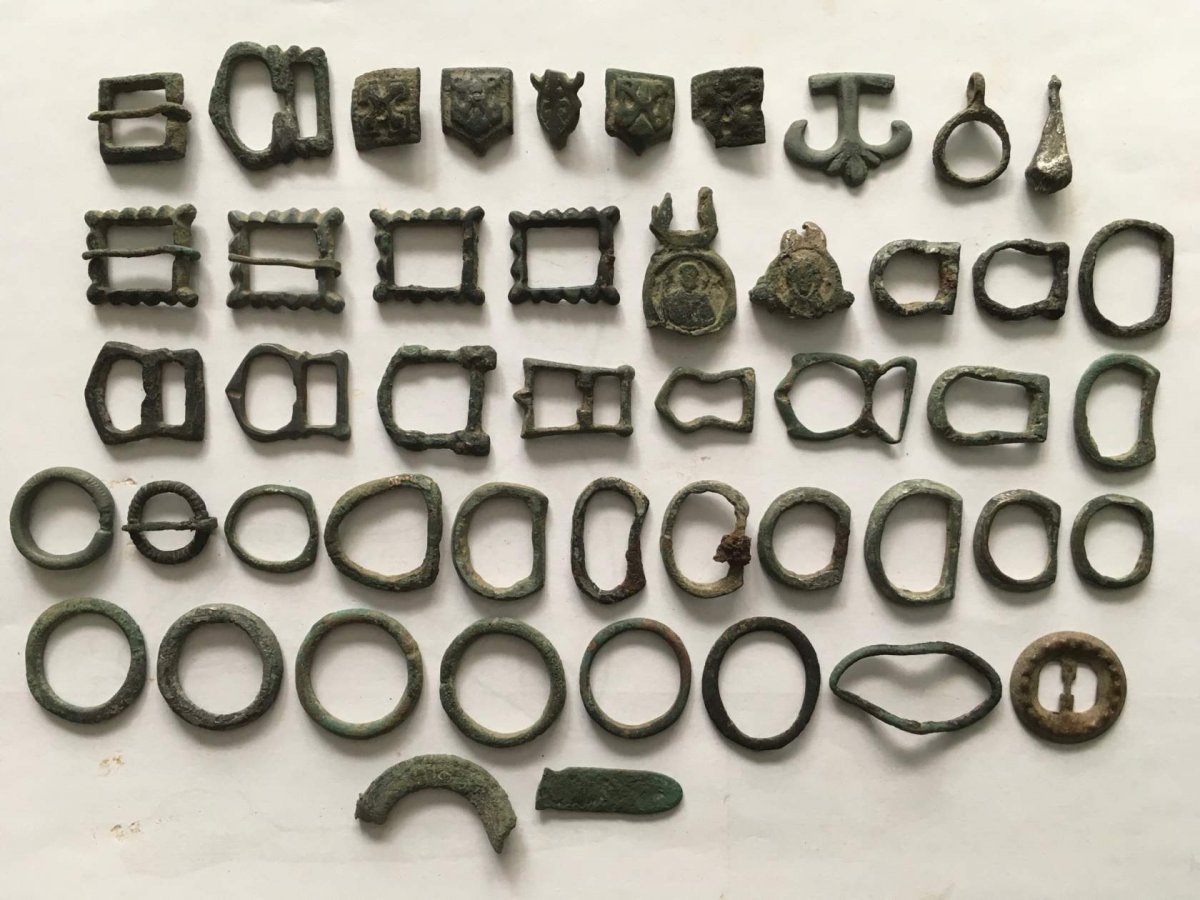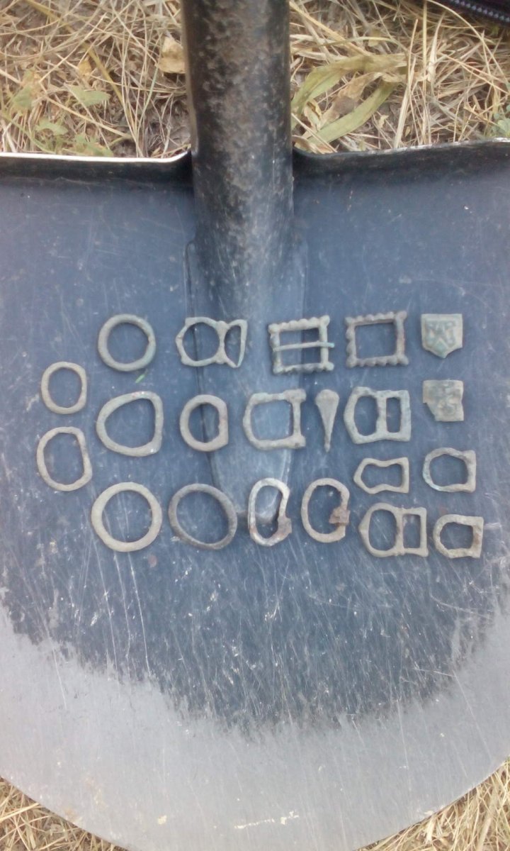 доброго времени всем форумчанам! на днях вырвался в поля и вот результат. все находки найдены на распаханном поле, на квадрате примерно 10на10. странность для меня заключается в том, что практически нет железа, только пара обломаных ножичков, ключ, обломок замка и железная пряжечка! из всех находок большинство именно бронз. пряжечки! возможно у кого есть какие либо мысли по этому поводу?? подскажите по четвертому фото: 1.это может быть остатками пояса? 3.иконки случайно не с энколпиона? 4.????? 5. что, не знаю что, вроде как из меди. будут какие мысли?? 6.тоже что то, капелька похоже с остатками посеребрения и что за висюлька такая? на третьем фото несколько пряжек и колец так же с остатками посеребрения. за раннее всем спасибо за проявленный интерес к теме.