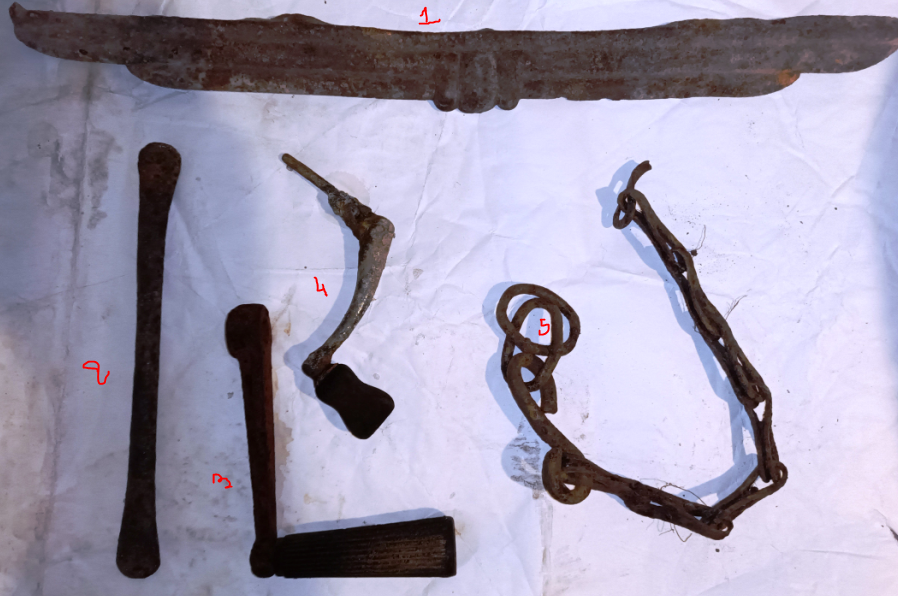 Вітаю.Підскажіть що від чого 1 думаю щось з капота авто.2 маленька фомка,цікавить до якого набору.3 ручка залізо,як ключ.4 ручка цам,цинк.5 ціпок.Все по 44 р знім рем майстерні.неподалік бувша бригада,колхоз,не виключно що щось звідти .(було виставлено в хлам,не пішло)Дякую.