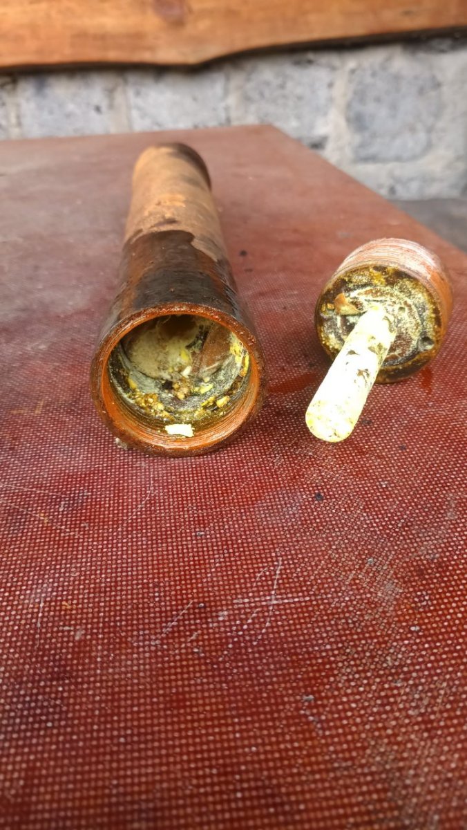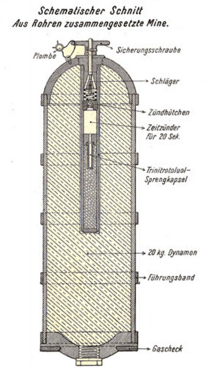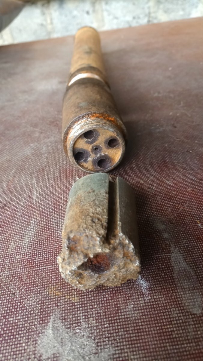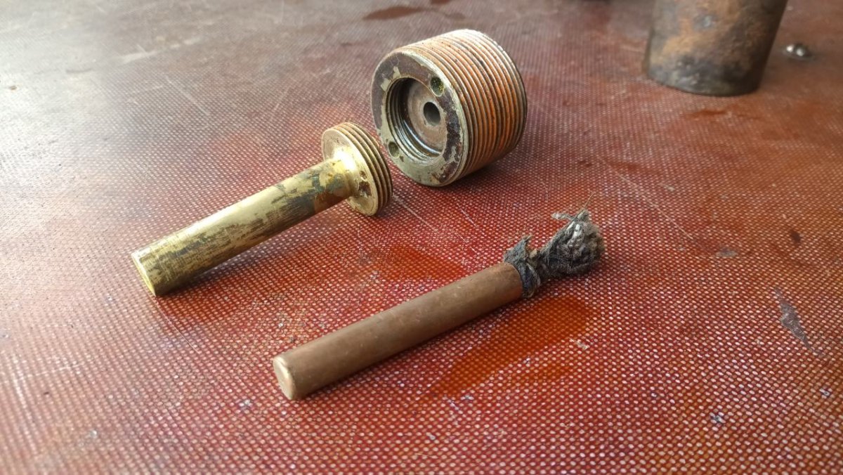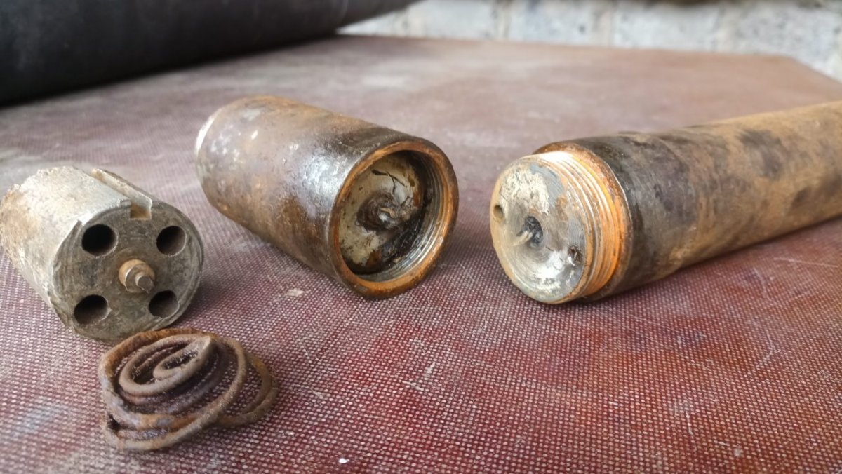 Вітаю! Попався ось такий 22,5 см. M.15 Wurf Mine mit Aufschlagzünder. Начинка звичайний динамон. А от детонатор ще такий не зустрічався. В середині промаслений гніт. Перша секція була відірвана по різьбі і вдавлена в глибину міни. Видно на одній з деталь слід горіння і плавлення металу. Але гніт далі чомусь не загорівся. Можливо хтось з таким детонатором зустрічався? Буду вдячний за любу інформацію.