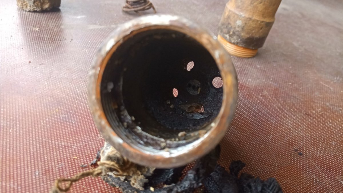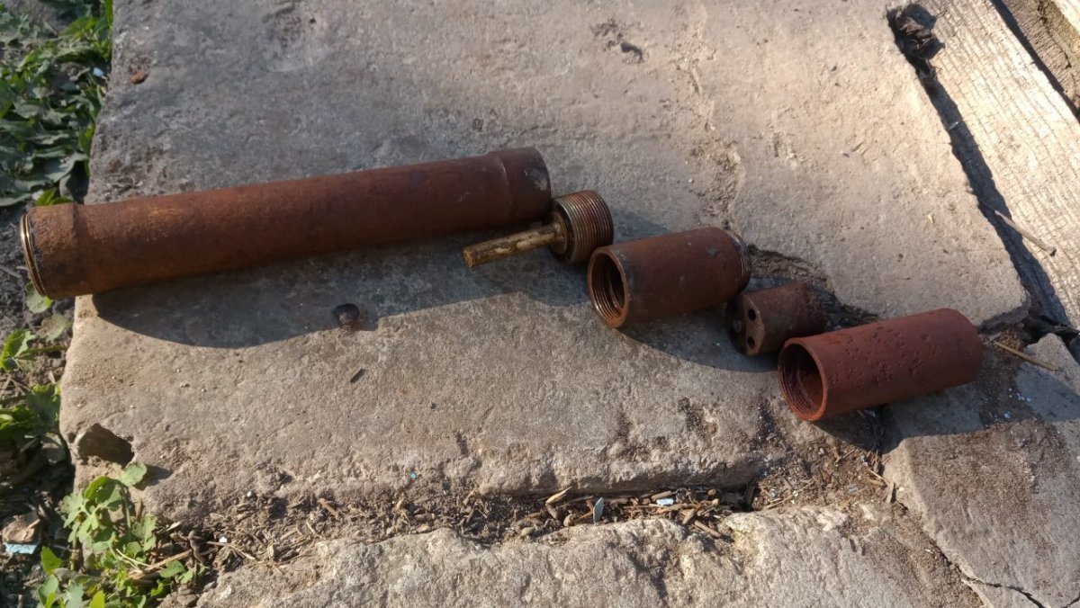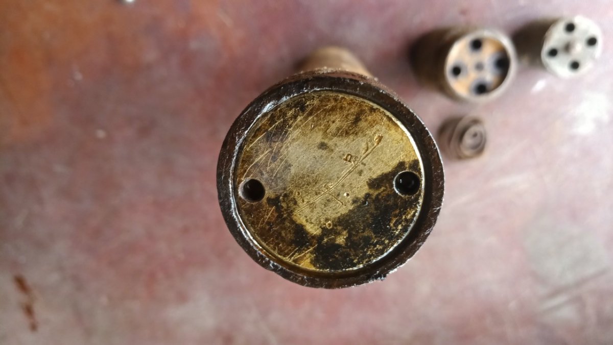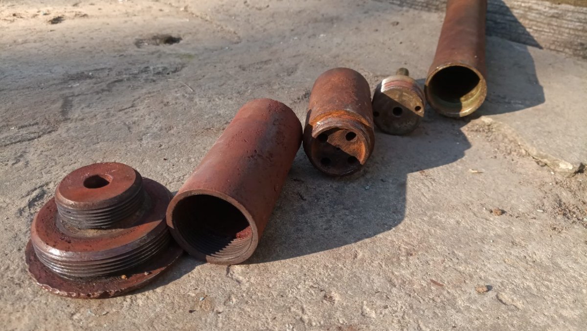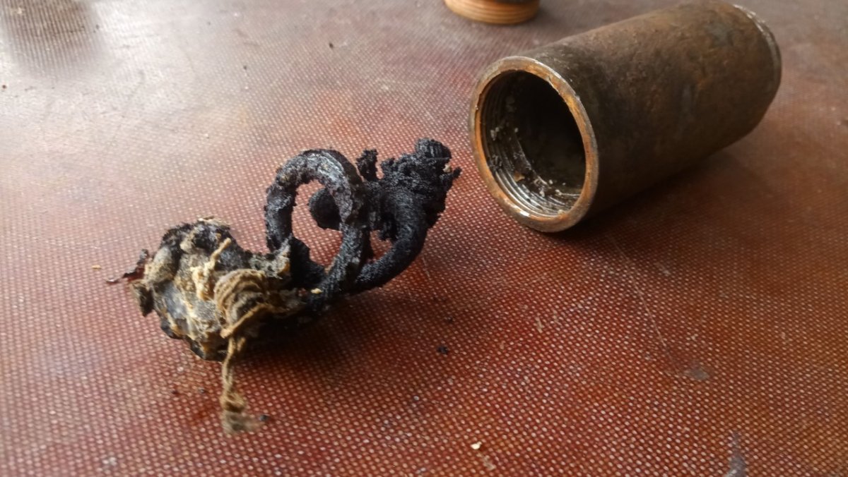Вітаю! Попався ось такий 22,5 см. M.15 Wurf Mine mit Aufschlagzünder. Начинка звичайний динамон. А от детонатор ще такий не зустрічався. В середині промаслений гніт. Перша секція була відірвана по різьбі і вдавлена в глибину міни. Видно на одній з деталь слід горіння і плавлення металу. Але гніт далі чомусь не загорівся. Можливо хтось з таким детонатором зустрічався? Буду вдячний за любу інформацію.