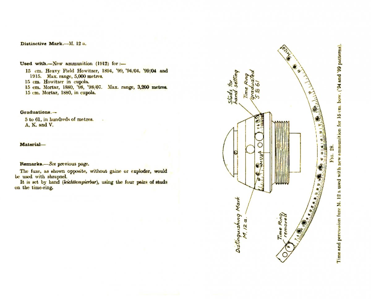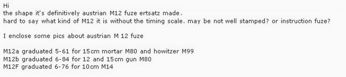 Добрый день. Я вот почему решил, что ЭТО именно "f". "М12а" шел к 15см шрапнели. "М12b" - к 12 и 15см шрапнелям. А вот "М12f" к 10см шрапнельным снарядам 10сm M.14 Feldhaubitze . На фото, что привел ТС не 12 или 15см шрапнель (лично мне так видится), по-этому остается только 10см и как следствие "М12f". Как бы я исходил только из этих аргументов и инфы, что взял в инете (фото №1). Могу заблуждаться. Пусть ТС разрешит наши сомнения, почистив находку и выложив её маркировку.