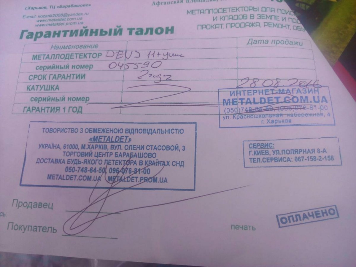 Спасибо за прибор,в прямом смысле "рабочий". Владелец только лопату забыл положить))) пришёл с копов и засунул прибор в упаковку. Благодаря такому "торгашу" прибор оказался у меня,т.к никто на него и внимания не обратил на сайте,фотки ни в дугу,катушка не понятно какая... Сегодня получил,отмыл,ободрал все пленки на наушниках и блоке,снял силиконовые "линзы" с кнопок блока и прозрел- новый прибор!!!!! И Гарантия только в августе закончилась! Спасибо Роме из Сумм за хороший прибор! С ув.