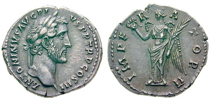 Доброго вечора, перший - денарій Антоніна Пія: ANTONINVS AVG PIVS P P TR P COS III, laureate head right / IMPERATOR II, Victory standing front, head left, holding wreath and palm. На майбутнє виставляйте монети тут: https://reibert.info/forums/monety.256/