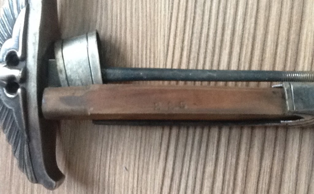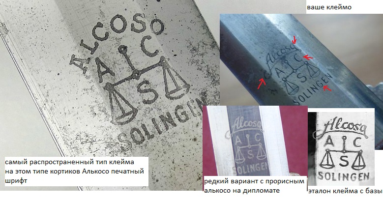 Предмет мне видится достаточно хорошей подделкой дипломата.Если сравнивать с недавно проскакивающими копиями с клеймом хойлер берлин) главный вопрос вызывает левое клеймо алькосо.Из тех что я встречал и вопросов ни у кого не вызывали верхние буквы Алькосо на клейме обычно на этих кортиках печатными,реже встречается прописью как на вашем.Но при детальном сравнении вывод один.У Вас фуфельное клеймо.В дальнейшем рассмотрение предмета считаю нецелеобразным так как с фуфельным клинком он для меня коллекционной ценности не представляет. с уважением Александр