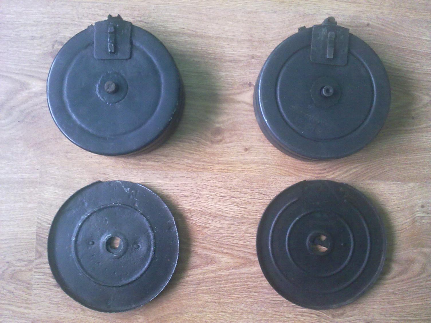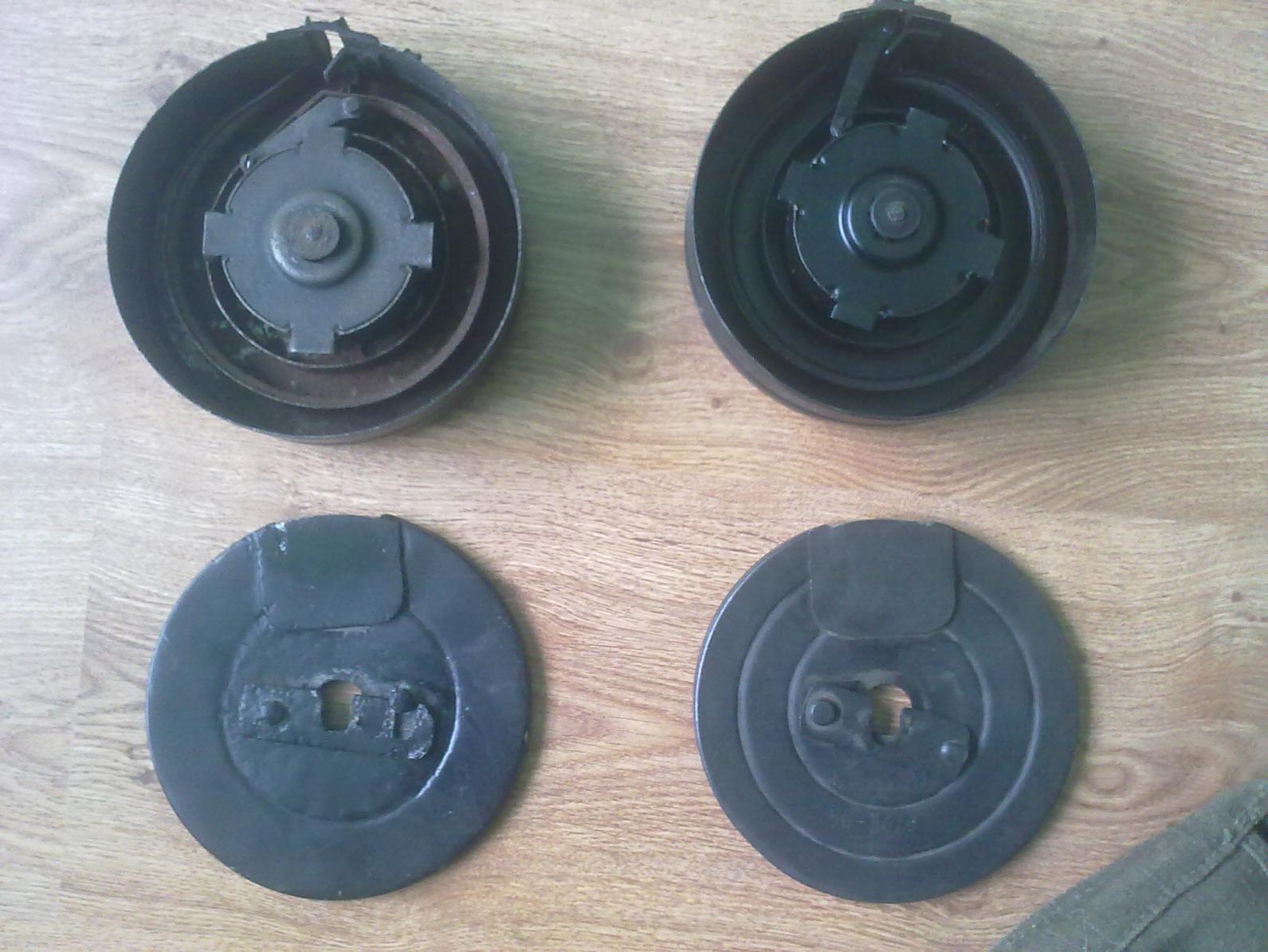 Предложу два диска ппш с макетами патронов.Первый ранний копаный,реставрированый с 72 шт.ммг патронов,пули уставшие,но для весу и антуражу само то.Второй бубен складской.Кожух ранний ,крышка поздняя,одна губа пиляная,но макеты не выскакивают.55 шт.макетов все бодрые,пули не доставались,отверстия деактива присутствуют на всех макетах.Цена копаного с макетами патронов 120 гривен+ пересыл,складского с макетами+подсумок 180 гривен+пересыл.Вопросы в личку.Пересыл по Украине "новой почтой""интайм""деливери".