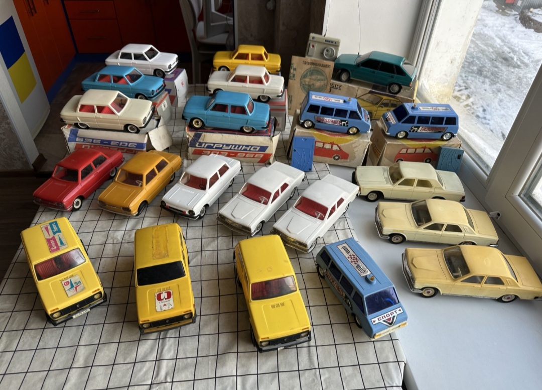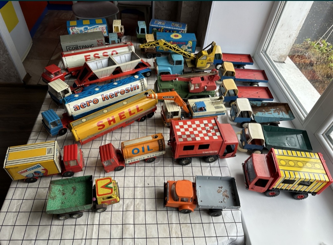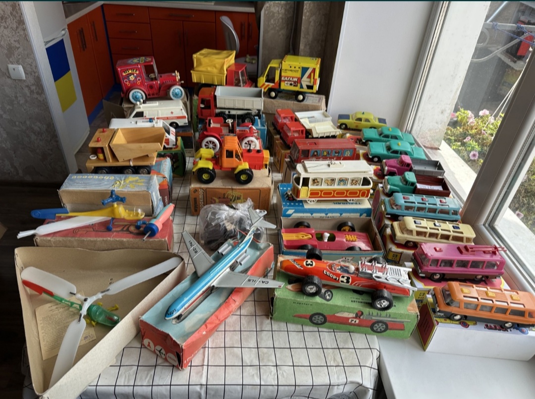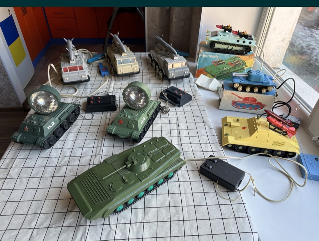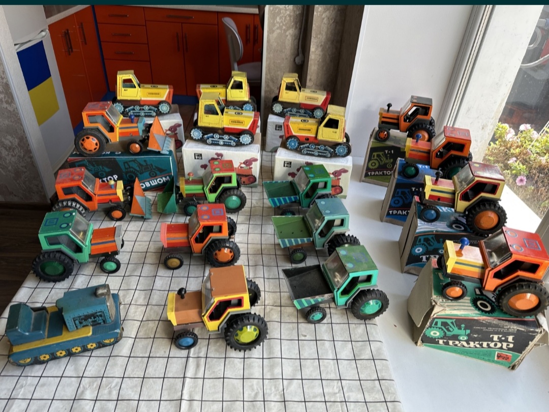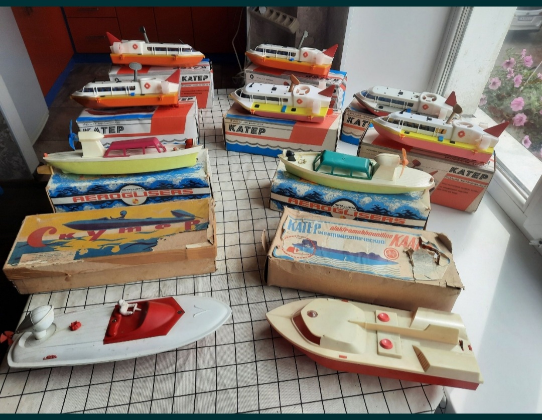 в мене було: пожежна машина з помпою, наливаєш воду, жамкаєш кнопку, вода пирскає, катамаран з повітряним гвинтом, на плоскій батарейці, пневматична пукалка пластиковими м'ячиками, типу помпової рушниці, м'ячики розміром з тенісні, малий теніс, декілька пістолетів на пістони і паперову стрічку, купа ігор з кубиками і магнітною стрілкою, на різні теми, історія, географія, пару конструкторів, з цеглинками і металеві, пізніше купили до десятка НДР івських збірних авіамоделей, дуже якісних, всі пасажирські совкові, найкрутіша модель першого космічного корабля, той що гагарінський, деталізована супер, навіть парашут був, можна було частково роз'єднувати після зборки. Німці комплектували декалями і срібною фарбою кожну модель. Клеєм також. В принципі все, більше згадати нічого з іграшок. Хоча вже тоді були в продажі моделі на радіокеруванні, але коштували півзарплати. Ще згадав в дружбана був автомобіль з приводом від троса, крутиш ручку, воно їде, тягнеш курок, повертає. І в нього ж була залізниця німецька, також трохи бавився, собі було задорого.