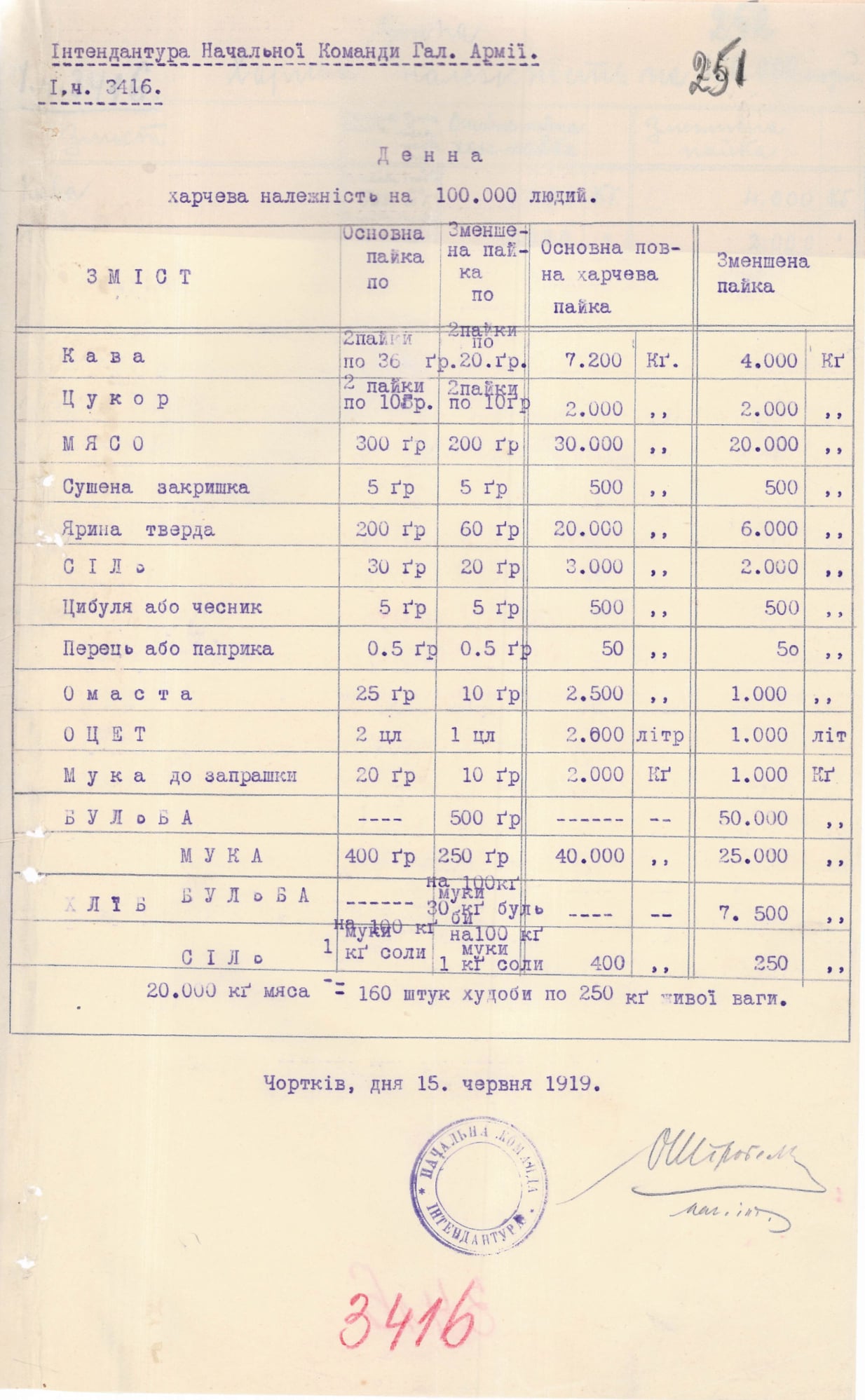 З документів Начальної команди Галицької армії денна харчова належність на 100 000 людей. Чортків, 15 червня 1919р.