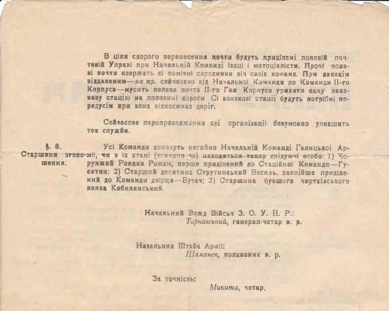 Розпоряд Начального вождя УГА М. Тарнавського про організацію поштових сполучень і забезпечення польових пошт мотоциклами.