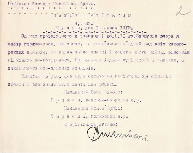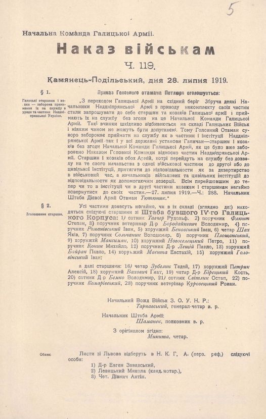 Наказ військам Начальної Команди Галицької армії щодо переходу галицьких старшин і козаків на службу в уряди та частини Наддніпрянської України. Кам'янець-Подільський. 28 липня 1919р.