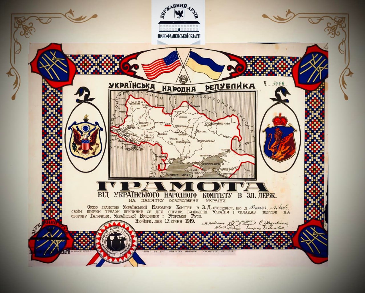 Грамота видана Василю Лівому (у 1929 р. – керівник ґміни Стриганці) від Українського народного комітету у Зл. Держ. (США) 17 січня 1919р. За те, що "щирим трудом і пожертвою причинив ся для справи визволення України" і складав жертви на оборону Галичини, Української Буковини і Угорської Руси". Художник - М.Дячишин.