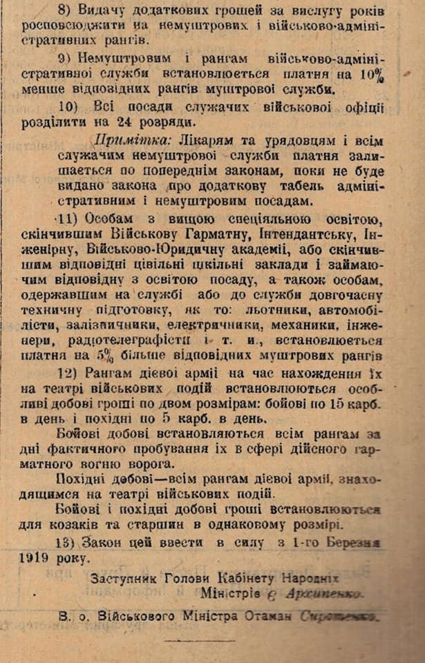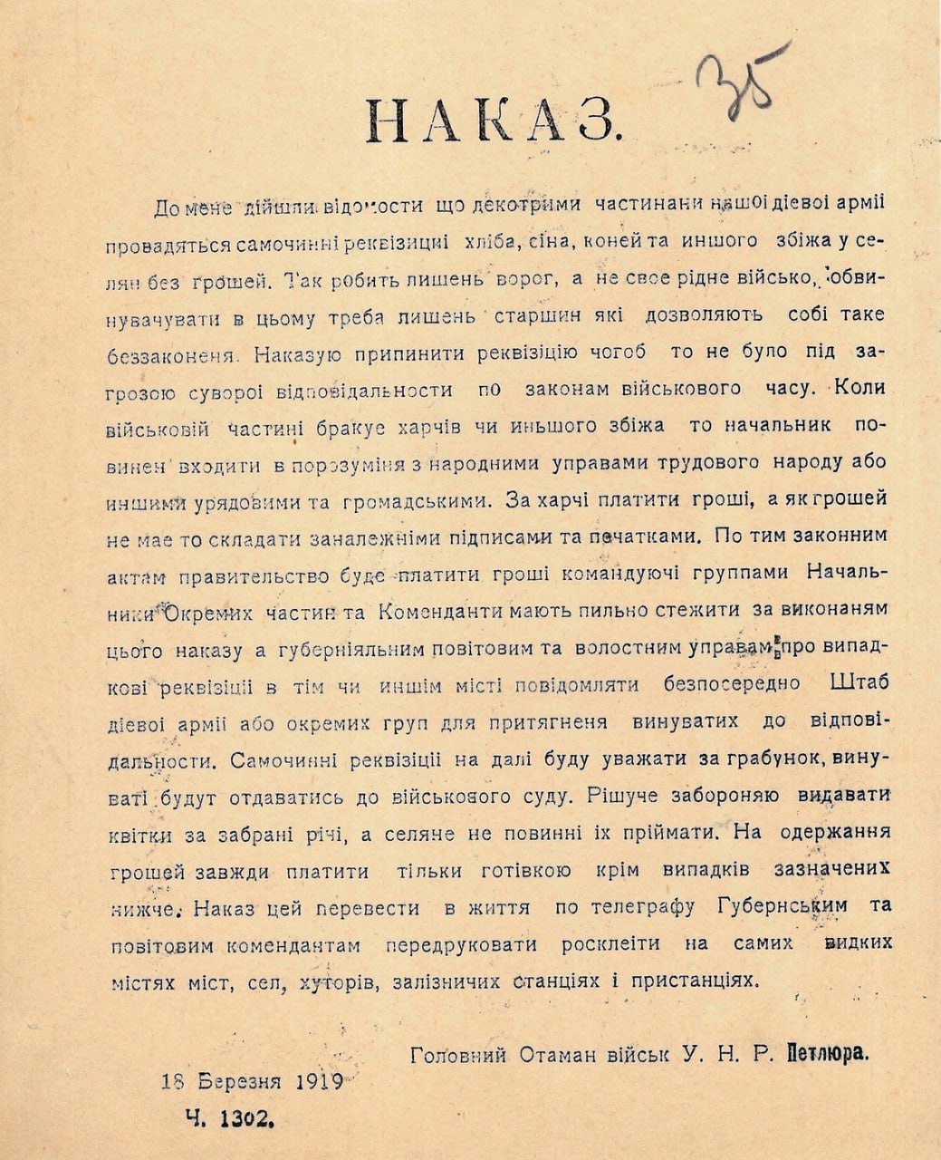 Наказ Головного Отамана військ УНР С. Петлюри про притягнення до відповідальності осіб, причетних до реквізиції хліба, сіна та коней у селян без оплати та домовленостей. 18 березня 1919р.