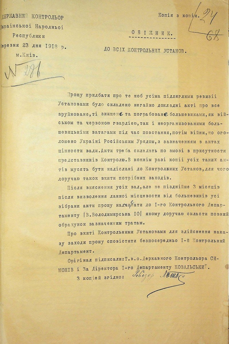 Обіжник Державного контролю до всіх контрольних установ про складання актів зруйнованого й пограбованого більшовиками. 23 березня 1918р.