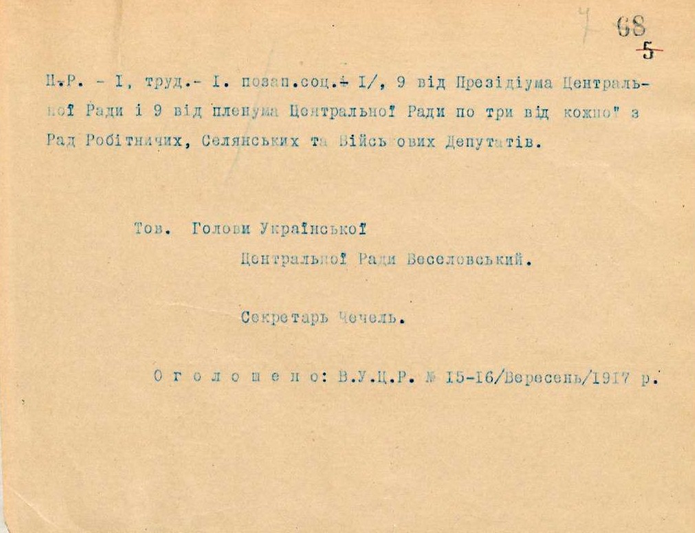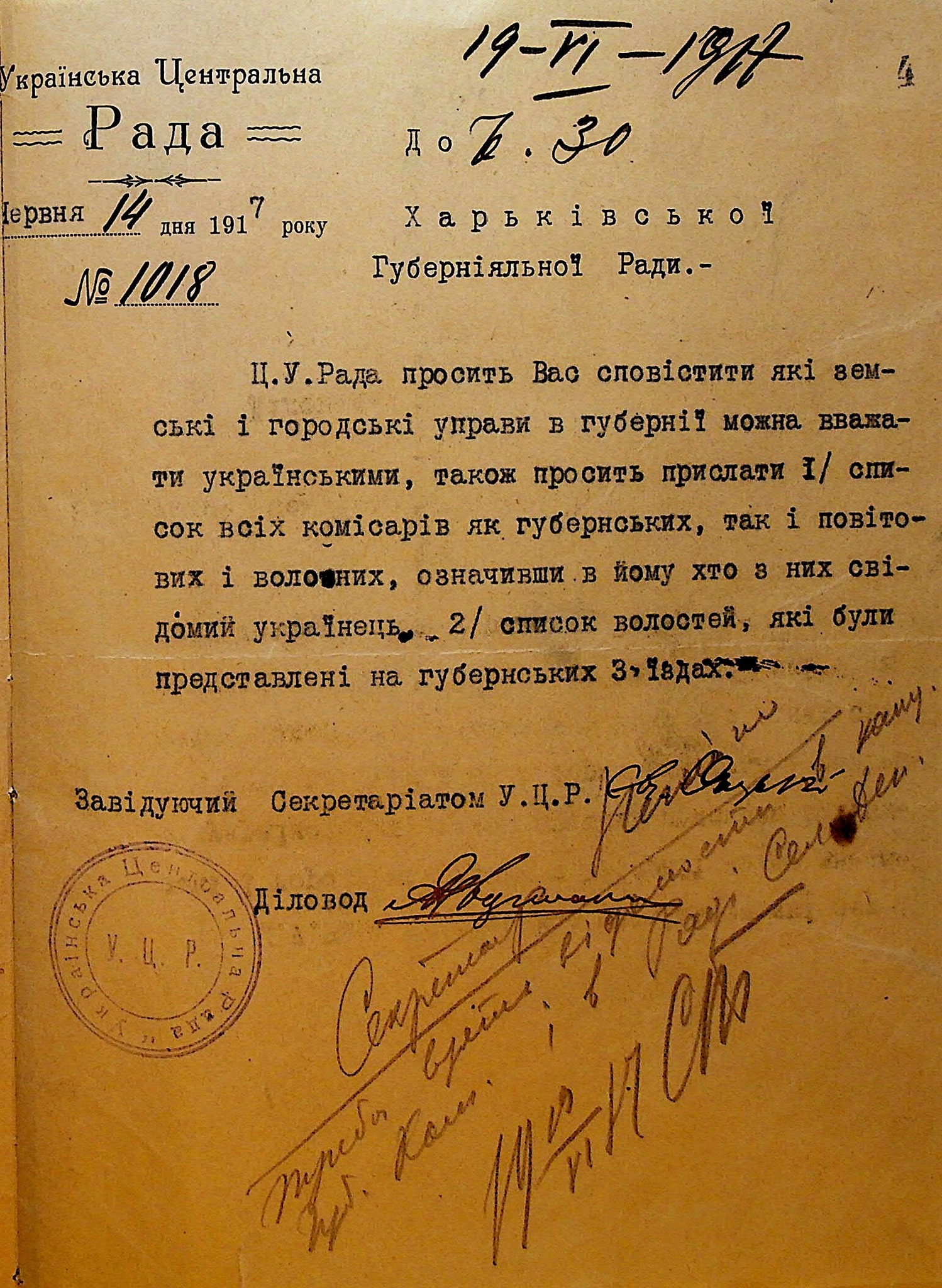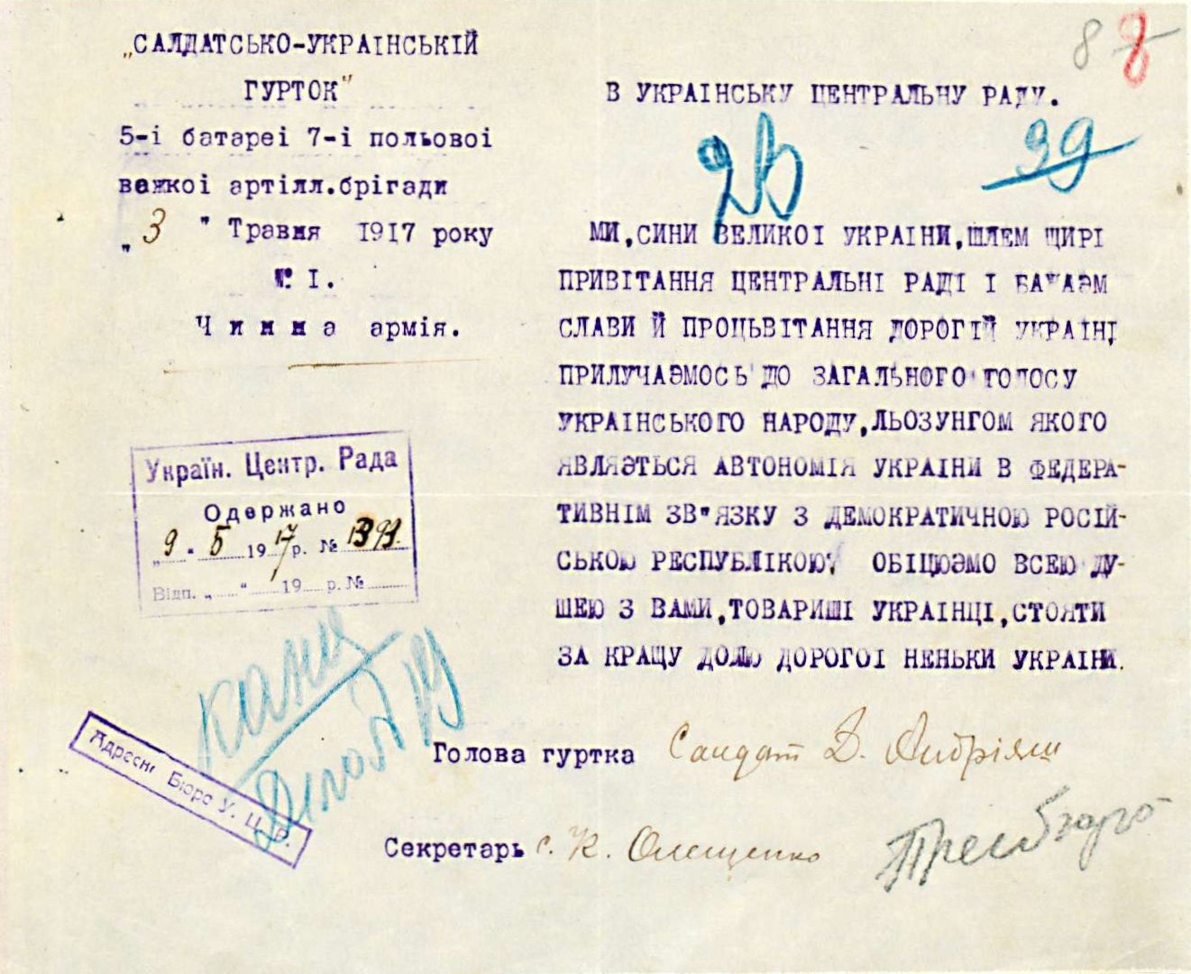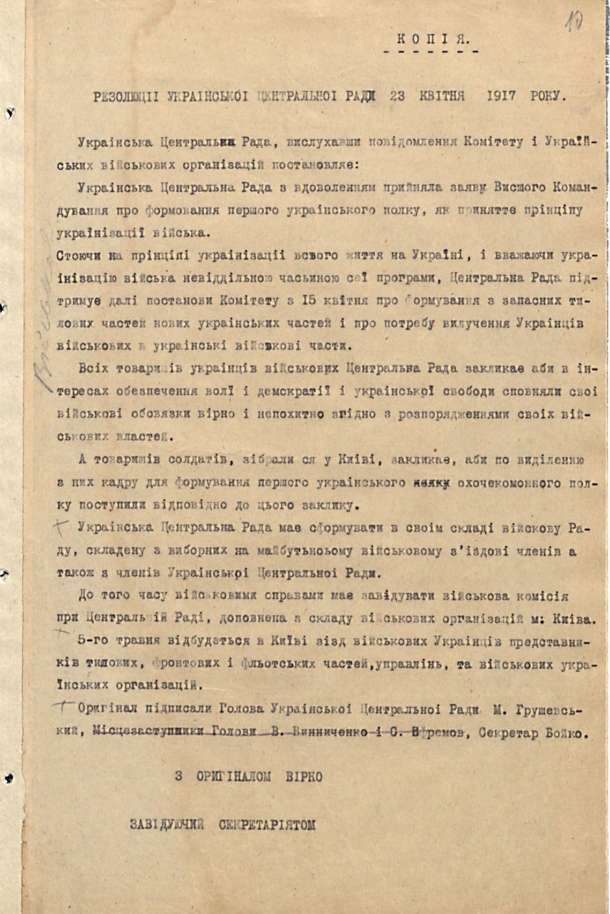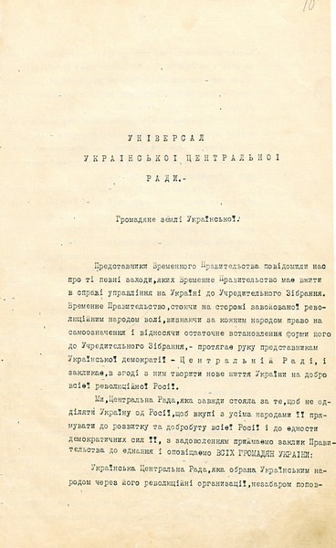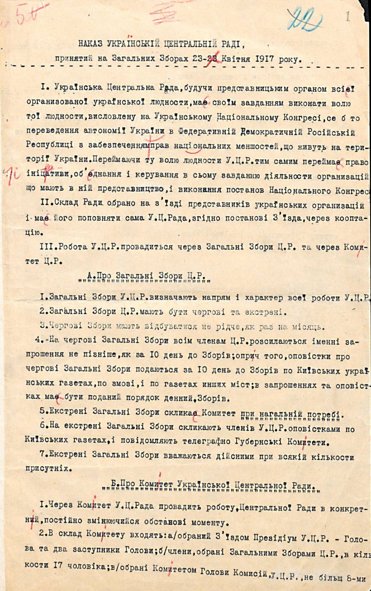 1. Наказ про структуру та діяльність Української Центральної Ради. 23 квітня 1917р. 2. Наказ про структуру та діяльність Української Центральної Ради. 23 квітня 1917р. 3. Лист «Солдатсько-українського» гуртка до Української Центральної Ради з привітаннями. 3 травня 1917р. 4. Копія телеграми представників Українських військових громад 7 армії до Української Центральної Ради з привітаннями. 2 червня 1917р. 5. Копія телеграми представників Українських військових громад 7 армії до Української Центральної Ради з привітаннями. 2 червня 1917р. 6. Лист Української Центральної Ради до Харківської губерніальної ради з проханням надіслати список губерніальних та повітових комісарів, які є свідомими українцями. 14 червня 1917р. 7. Лист-вітання Товариства “Просвіта” залізничних службовців станції Біла Церква до Української Центральної Ради. 17 червня 1917р. 8. Постанова Української Центральної Ради про компетенцію та склад Української Центральної Ради. 29 червня 1917р. 9. Постанова Української Центральної Ради про компетенцію та склад Української Центральної Ради. 29 червня 1917р. 10. Лист Української громади в Могилеві до Українського Військового Генерального комітету про визнання Української Центральної Ради та Українського генерального військового комітету. 1 липня 1917р.