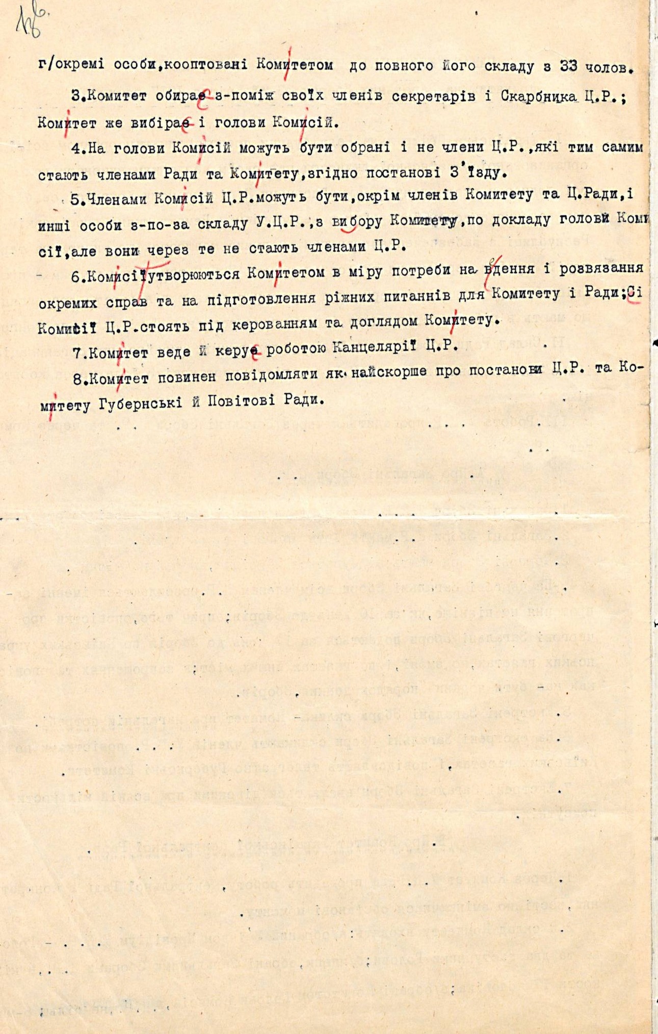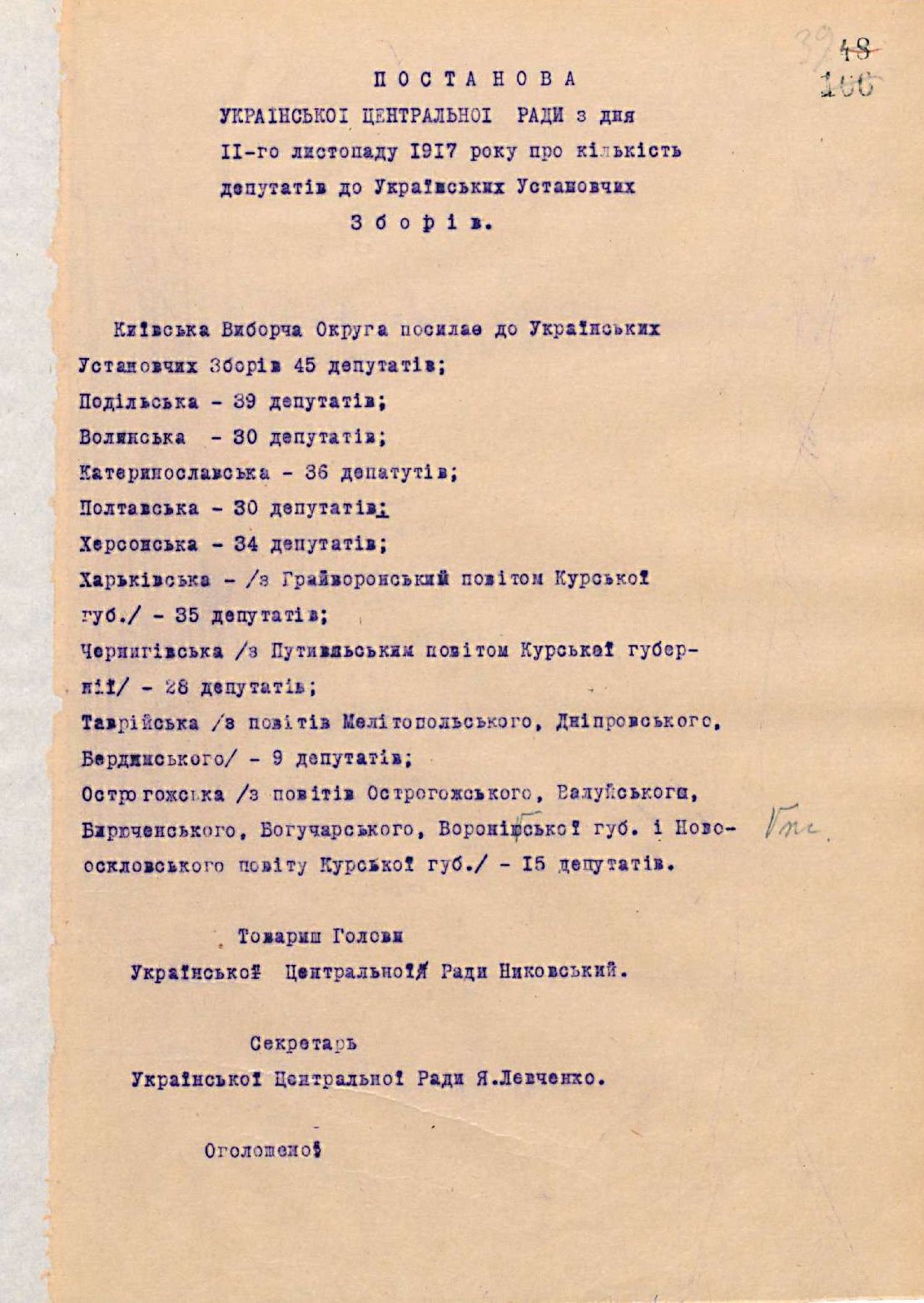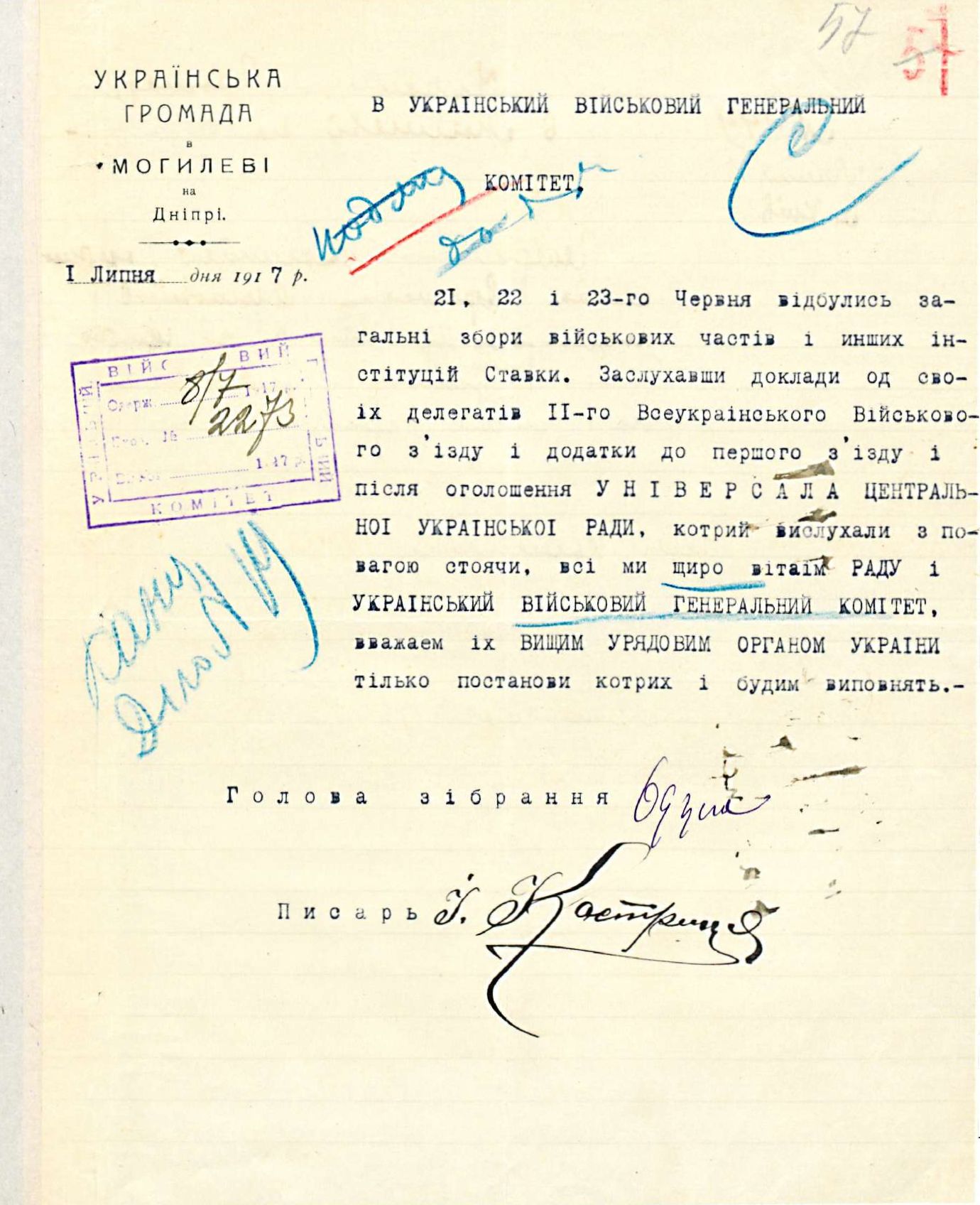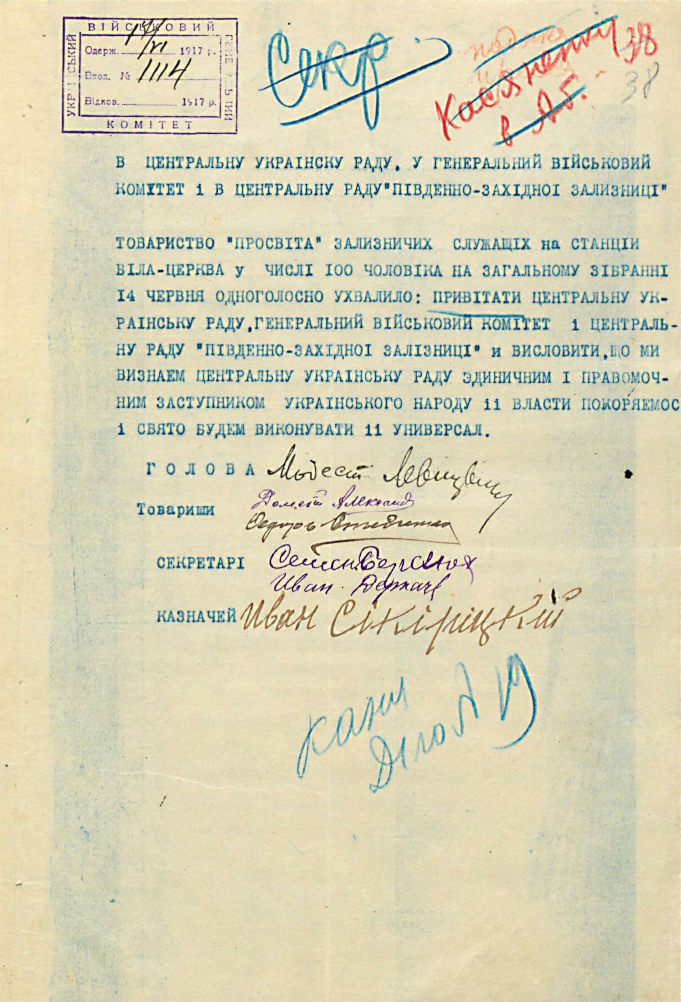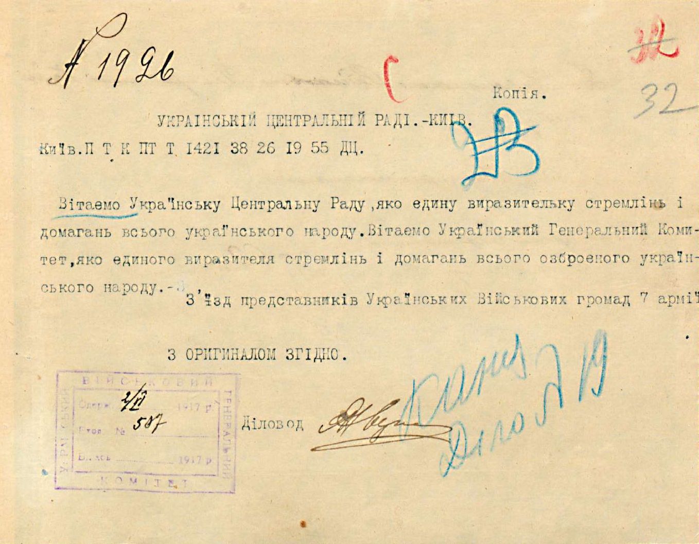 1. Наказ про структуру та діяльність Української Центральної Ради. 23 квітня 1917р. 2. Наказ про структуру та діяльність Української Центральної Ради. 23 квітня 1917р. 3. Лист «Солдатсько-українського» гуртка до Української Центральної Ради з привітаннями. 3 травня 1917р. 4. Копія телеграми представників Українських військових громад 7 армії до Української Центральної Ради з привітаннями. 2 червня 1917р. 5. Копія телеграми представників Українських військових громад 7 армії до Української Центральної Ради з привітаннями. 2 червня 1917р. 6. Лист Української Центральної Ради до Харківської губерніальної ради з проханням надіслати список губерніальних та повітових комісарів, які є свідомими українцями. 14 червня 1917р. 7. Лист-вітання Товариства “Просвіта” залізничних службовців станції Біла Церква до Української Центральної Ради. 17 червня 1917р. 8. Постанова Української Центральної Ради про компетенцію та склад Української Центральної Ради. 29 червня 1917р. 9. Постанова Української Центральної Ради про компетенцію та склад Української Центральної Ради. 29 червня 1917р. 10. Лист Української громади в Могилеві до Українського Військового Генерального комітету про визнання Української Центральної Ради та Українського генерального військового комітету. 1 липня 1917р.