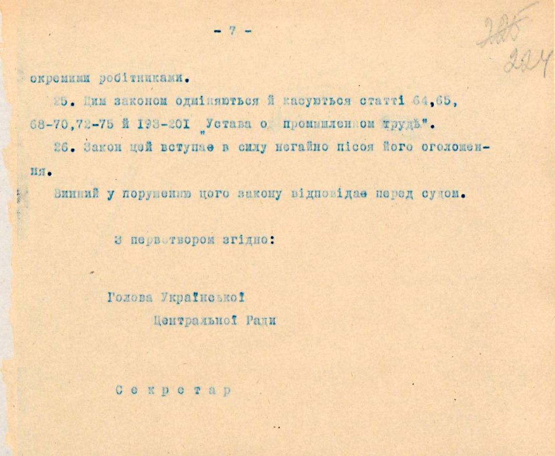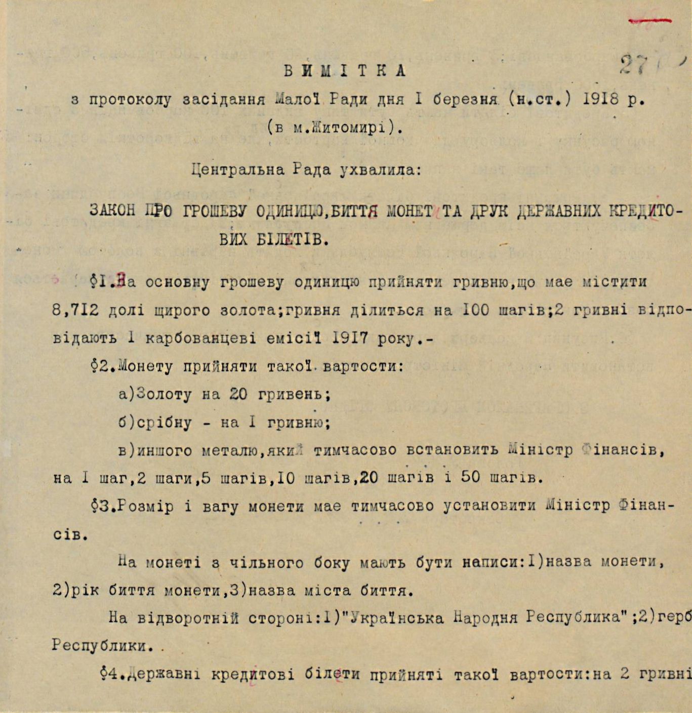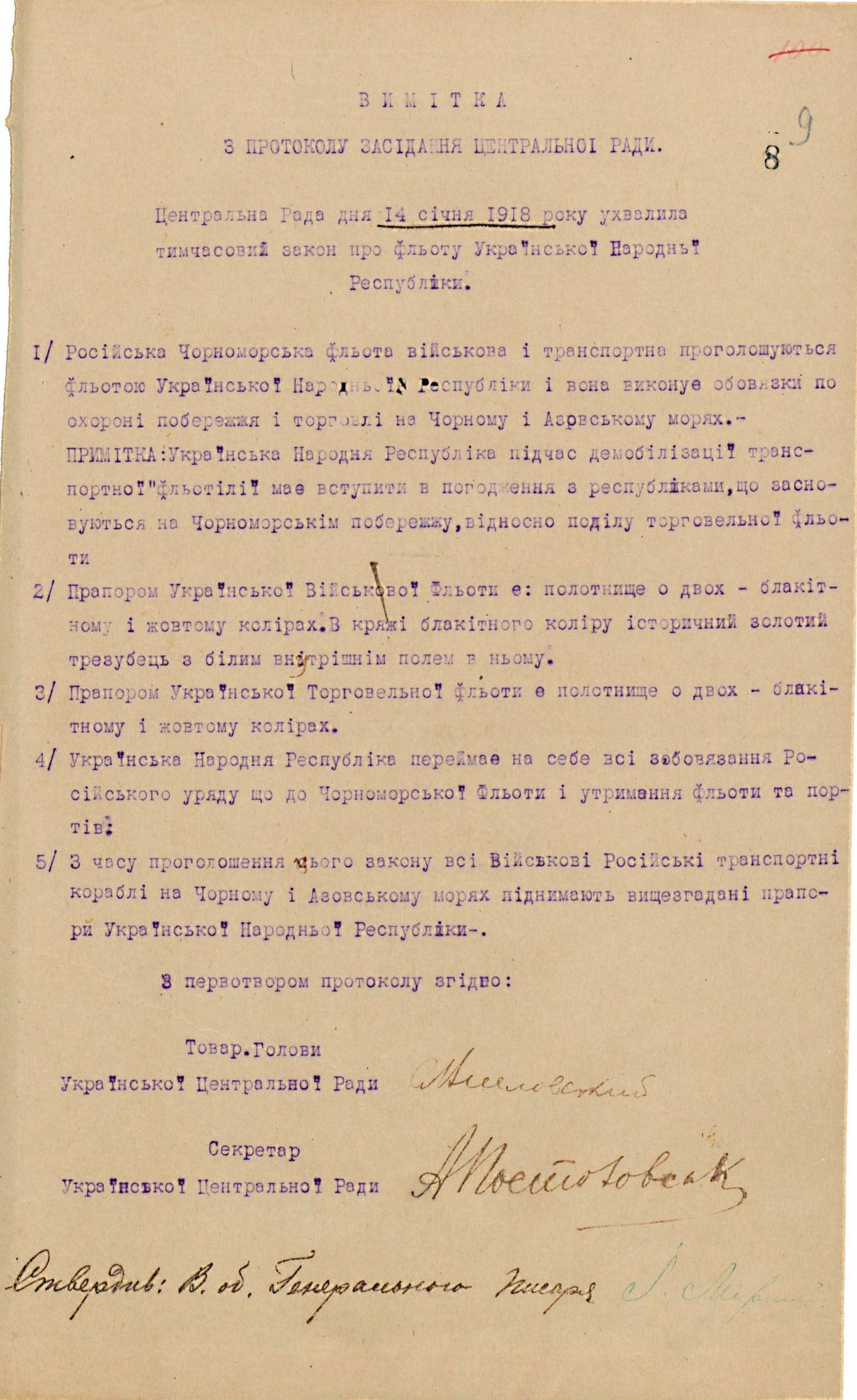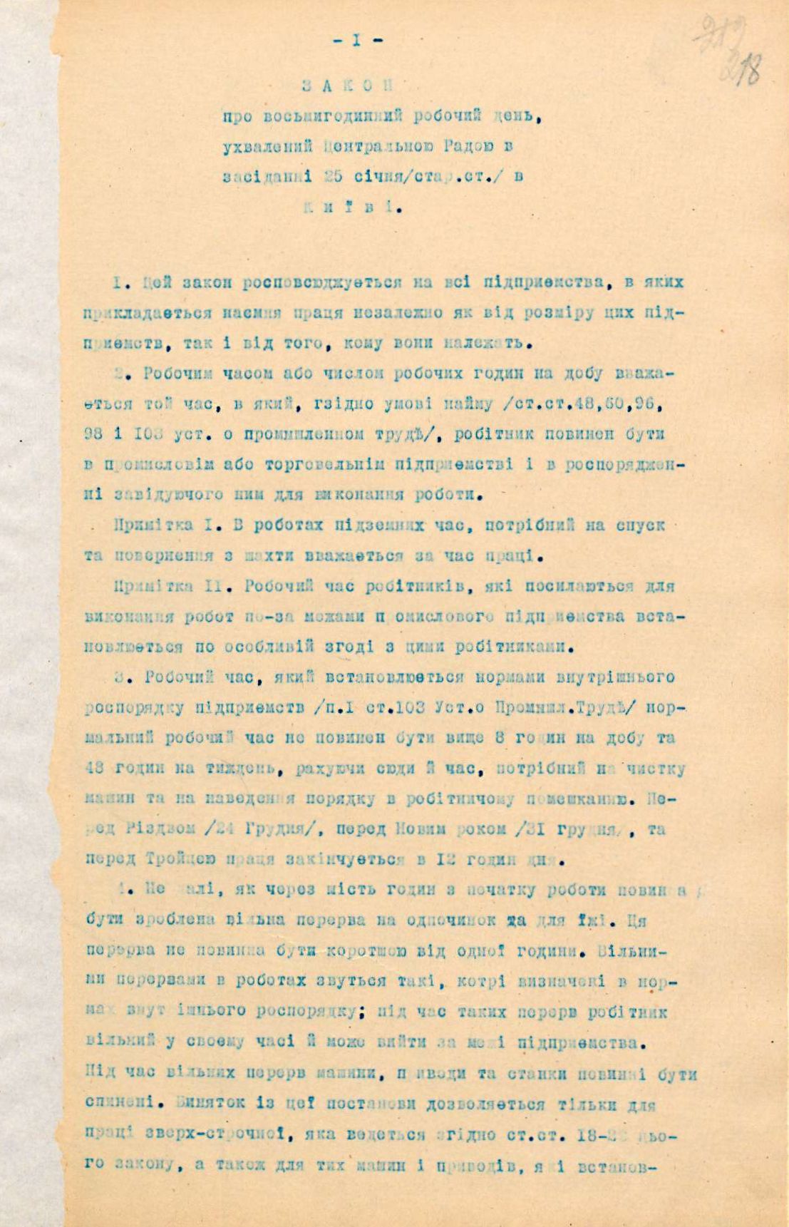 1. Тимчасовий закон про флот Української Народної Республіки. 14 січня 1918р. 2. Закон про переведення українського флоту на вільний найм. 14 січня 1918р. 3. Закон ухвалений Центральною Радою про восьмигодинний робочий день. 25 січня 1918р. 4. Закон ухвалений Центральною Радою про восьмигодинний робочий день. 25 січня 1918р. 5. Закон ухвалений Центральною Радою про восьмигодинний робочий день. 25 січня 1918р. 6. Закон ухвалений Центральною Радою про восьмигодинний робочий день. 25 січня 1918р. 7. Закон ухвалений Центральною Радою про восьмигодинний робочий день. 25 січня 1918р. 8. Закон ухвалений Центральною Радою про восьмигодинний робочий день. 25 січня 1918р. 9. Закон ухвалений Центральною Радою про восьмигодинний робочий день. 25 січня 1918р. 10. Закон про грошову одиницю, биття монет та друк державних кредитових білетів. 1 березня 1918р. 11. Закон про грошову одиницю, биття монет та друк державних кредитових білетів. 1 березня 1918р.