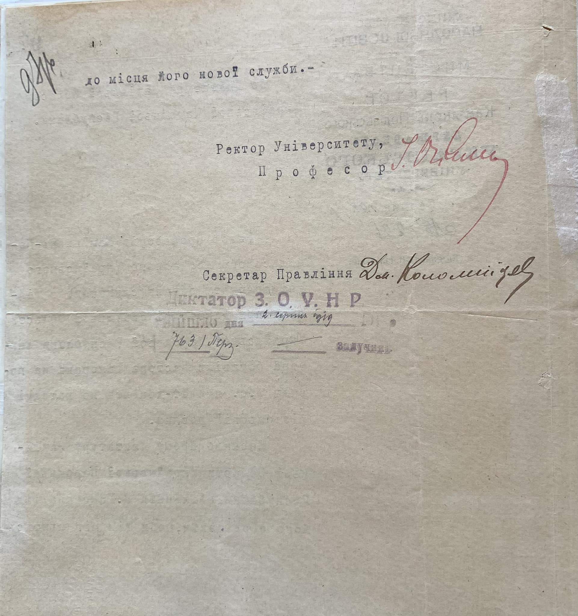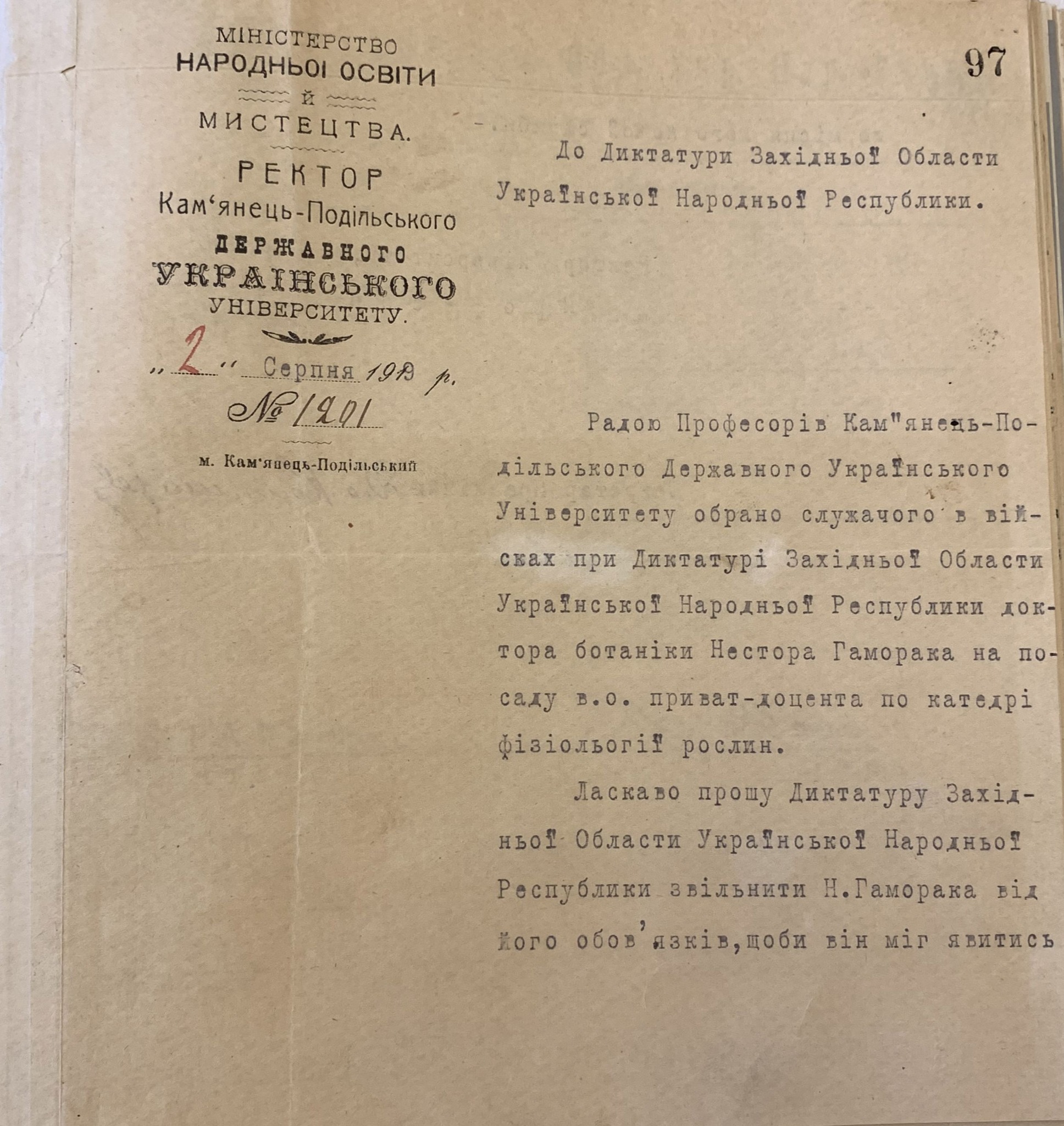 Лист ректора Кам’янець-Подільського державного українського університету Івана Огієнка до Диктатури ЗО УНР щодо обрання доктора ботаніки Нестора Гаморака на посаду в. о. приват-доцента. 2 серпня 1919р.