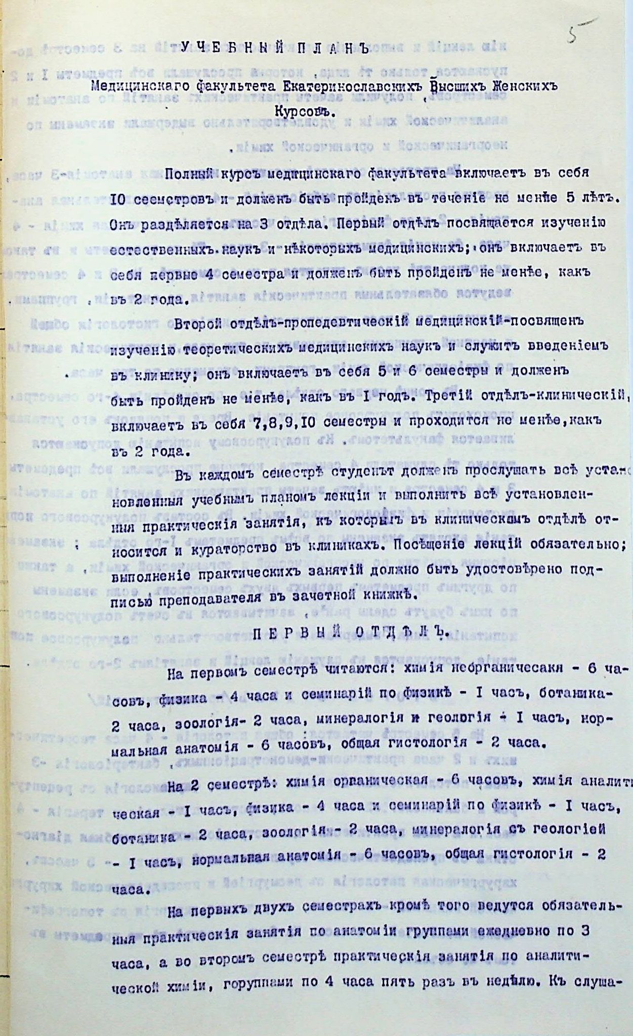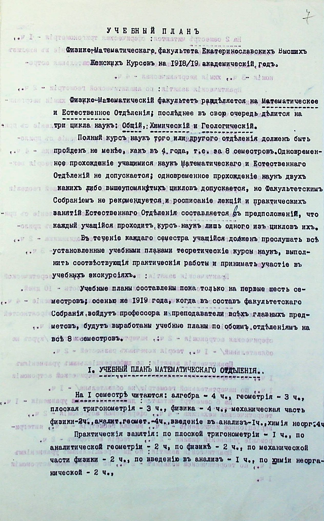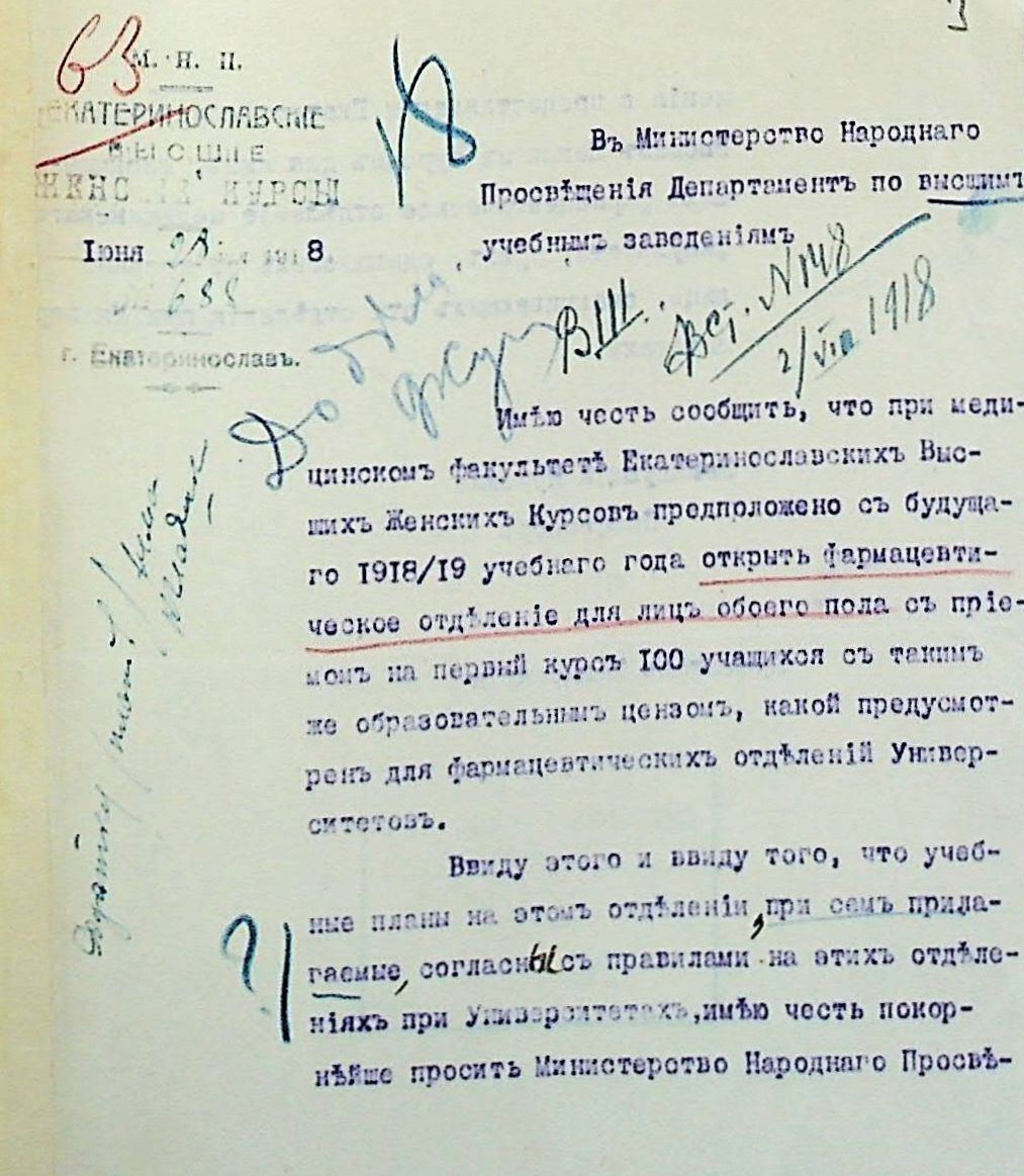 Кілька архівних документів 1917–1918 років, присвячених історії Катеринославських вищих жіночих курсів, що зберігаються у Центральному державному архіві вищих органів влади та управління України у фонді 2201 – «Міністерство освіти Української Держави, м. Київ». 1. Лист завідувача Катеринославськими вищими жіночими курсами до Департаменту вищих навчальних закладів Міністерства народної освіти щодо відкриття при медичному факультеті фармацевтичного відділення. 28 червня 1918р. 2. Лист завідувача Катеринославськими вищими жіночими курсами до Департаменту вищих навчальних закладів Міністерства народної освіти щодо відкриття при медичному факультеті фармацевтичного відділення. 28 червня 1918р. 3. Навчальний план медичного факультету Катеринославських вищих жіночих курсів. Не пізніше 1918р. 4. Навчальний план медичного факультету Катеринославських вищих жіночих курсів. Не пізніше 1918р. 5. Навчальний план медичного факультету Катеринославських вищих жіночих курсів. Не пізніше 1918р. 6. Навчальний план медичного факультету Катеринославських вищих жіночих курсів. Не пізніше 1918р. 7. Навчальний план фізико-математичного факультету Катеринославських вищих жіночих курсів на 1918-1919 навчальний рік. Не пізніше 1918р. 8. Навчальний план фізико-математичного факультету Катеринославських вищих жіночих курсів на 1918-1919 навчальний рік. Не пізніше 1918р. 9. Навчальний план фізико-математичного факультету Катеринославських вищих жіночих курсів на 1918-1919 навчальний рік. Не пізніше 1918р. 10. Навчальний план фізико-математичного факультету Катеринославських вищих жіночих курсів на 1918-1919 навчальний рік. Не пізніше 1918р. 11.Навчальний план фізико-математичного факультету Катеринославських вищих жіночих курсів на 1918-1919 навчальний рік. Не пізніше 1918р.