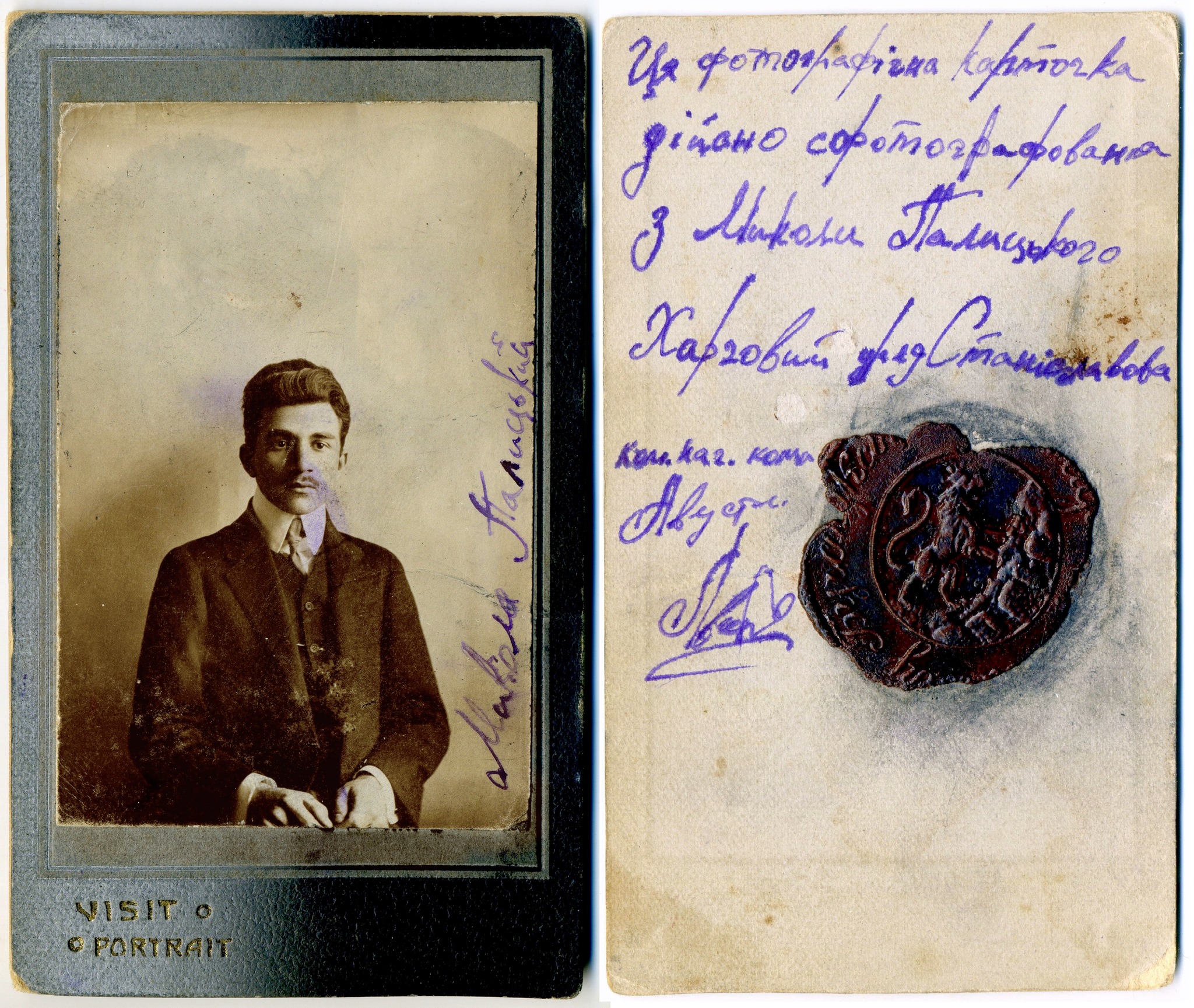 Посвідкова картка й досі невідомої для дослідників особистості періоду ЗУНР Миколи Палицького, про якого жодної не знайдено біографії. Позаду картки сургучова печатка з гербом ЗУНР (видніється перше слово «Бучацький…) і написано чорнилом: "Ця фотографічна карточка дійсно сфотографована з Миколи Палицького. Харчовий уряд Станіславова...". Підписана командиром начальної команди Авустл.