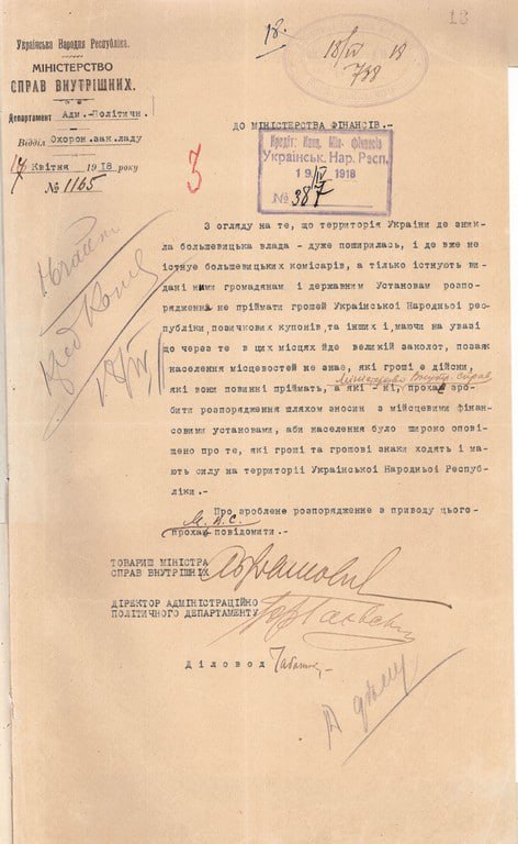 Лист Міністерства внутрішніх справ Міністерству фінансів УНР про необхідність оповіщення населення щодо грошових знаків, які мають силу на території УНР. 17 квітня 1918р.