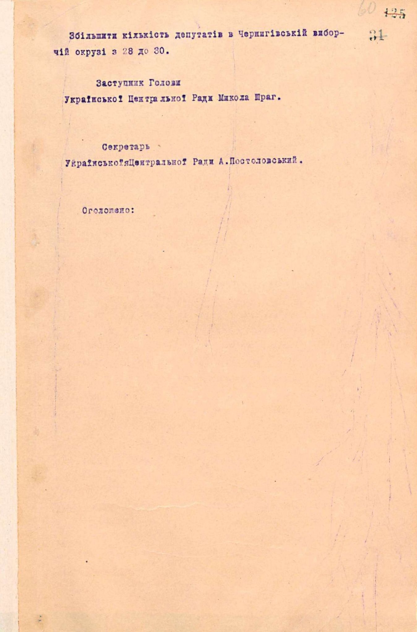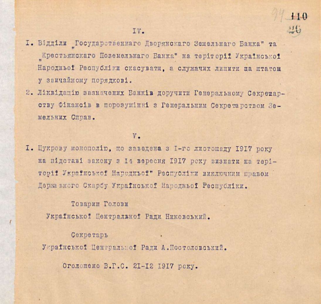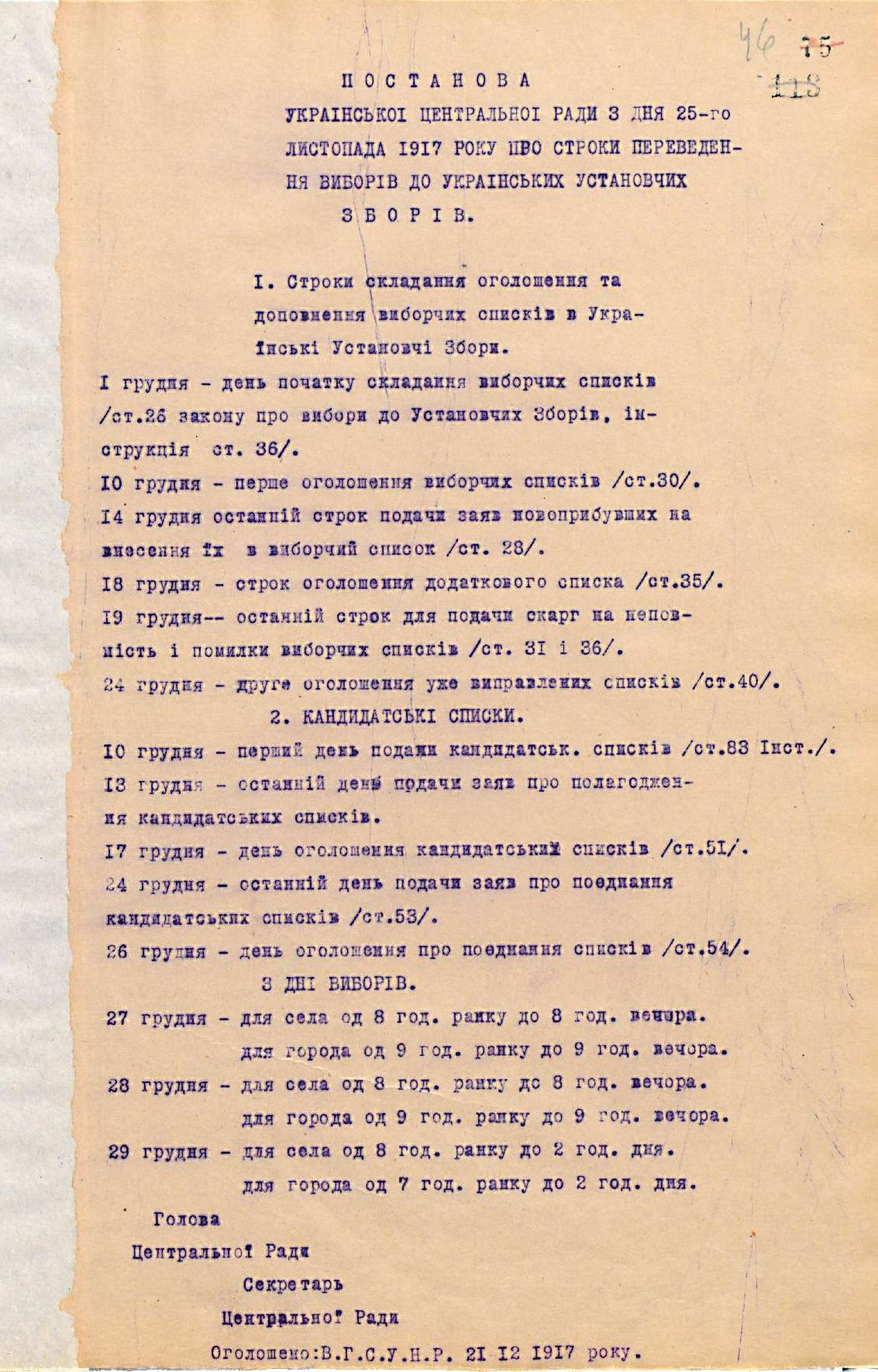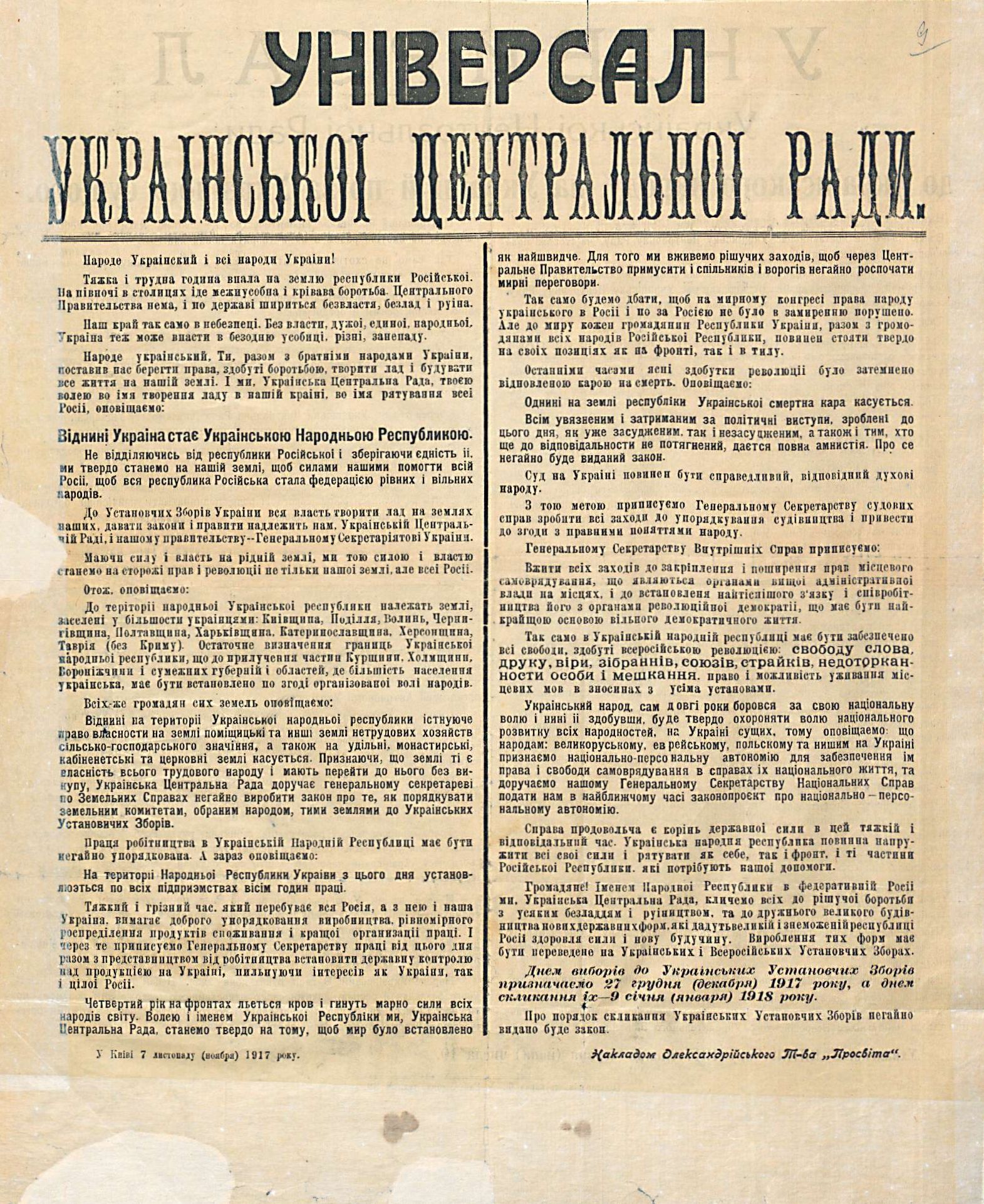 1. Витяг з протоколу засідання Комітету Центральної Ради про суд в Україні. 10 листопада 1917р. 2. Постанова Української Центральної Ради про кількість депутатів до Українських Установчих зборів. 11 листопада 1917р. 3. Закон про зміну назв земських інституцій. 19 листопада 1917р. 4. Постанова Української Центральної Ради про строки проведення виборів до Українських Установчих зборів. 25 листопада 1917р. 5. Закон Української Центральної Ради: 1) про прибуток державного скарбу Української Народної Республіки; 2) про головну скарбницю Української Народної Республіки; 3) про український банк; 4) про ліквідацію відділів Державного дворянського земельного банку та Селянського поземельного банку; 5) про визнання цукрової монополії виключним правом державного скарбу Української Народної Республіки. 9 грудня 1917р. 6. Закон Української Центральної Ради: 1) про прибуток державного скарбу Української Народної Республіки; 2) про головну скарбницю Української Народної Республіки; 3) про український банк; 4) про ліквідацію відділів Державного дворянського земельного банку та Селянського поземельного банку; 5) про визнання цукрової монополії виключним правом державного скарбу Української Народної Республіки. 9 грудня 1917р. 7. Закон Української Центральної Ради щодо змін статей закону про вибори до Установчих зборів Української Народної Республіки і додатків до нього. 15 грудня 1917р. 8. Закон Української Центральної Ради щодо змін статей закону про вибори до Установчих зборів Української Народної Республіки і додатків до нього. 15 грудня 1917р. 9. Закон про утворення Українського народного війська. 3 січня 1918р. 10. Закон про утворення Українського народного війська. 3 січня 1918р.