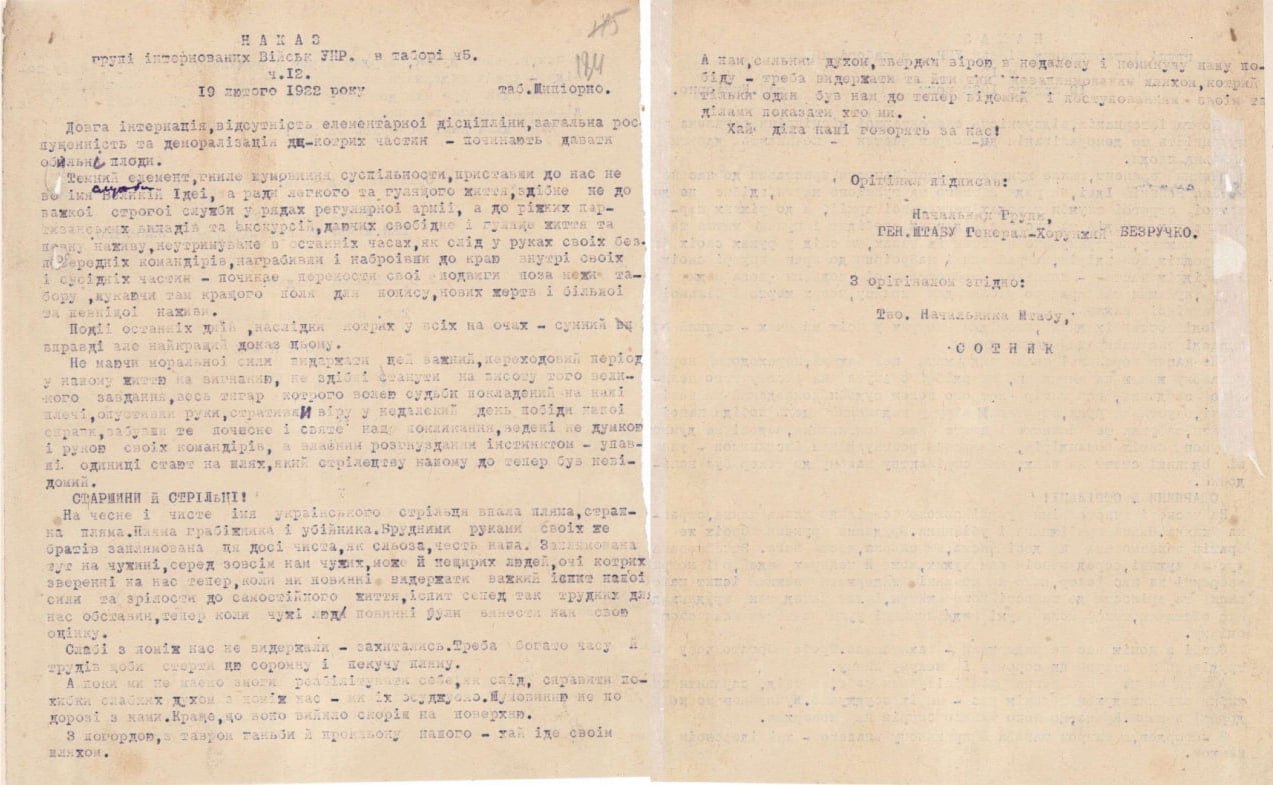 Про заклик до старшин і стрільців табору Щипйорно не плямувати честь українського війська ганебними вчинками. З Наказу Групі інтернованих військ УНР. 19 лютого 1922р.