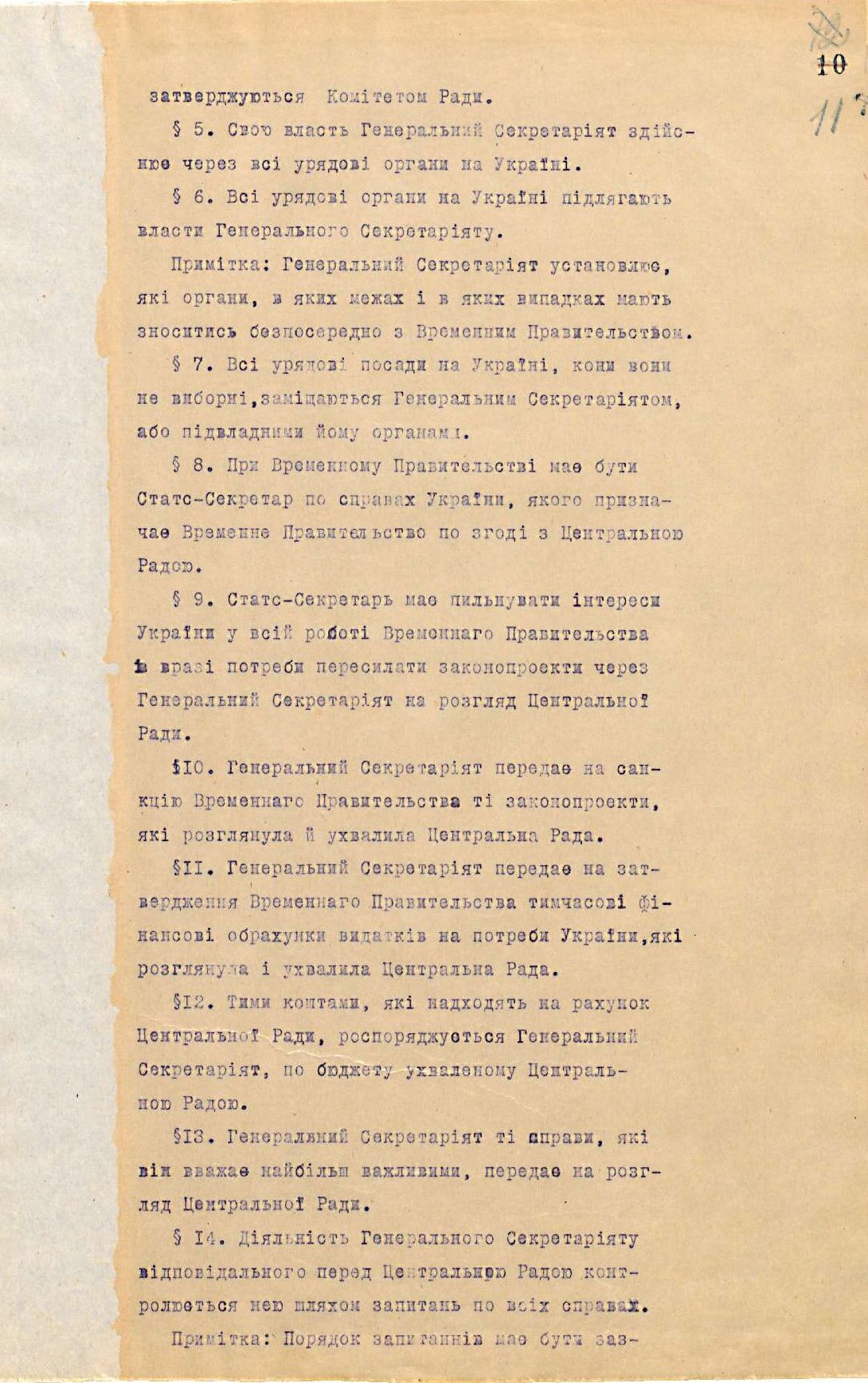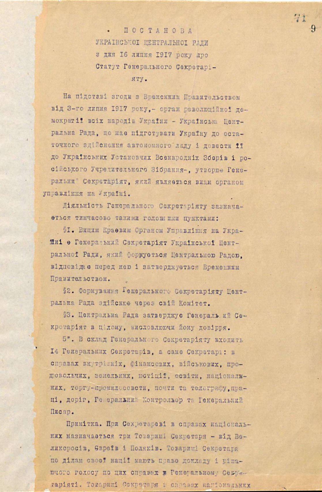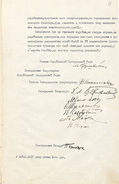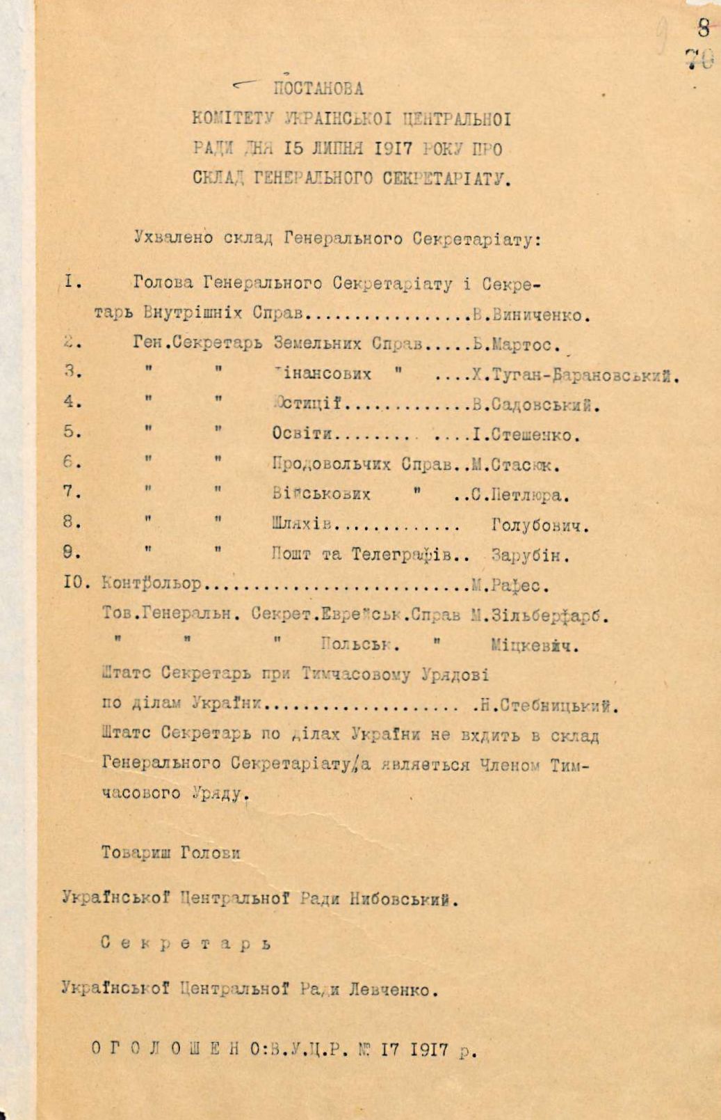 1. Другий універсал Української Центральної Ради. 3 липня 1917р. 2. Другий універсал Української Центральної Ради. 3 липня 1917р. 3. Другий універсал Української Центральної Ради. 3 липня 1917р. 4. Постанова Комітету Української Центральної Ради про посаду Генерального писаря. 10 липня 1917р. 5. Постанова Комітету Української Центральної Ради про склад Генерального Секретаріату. 15 липня 1917р. 6. Постанова Української Центральної Ради про Статут Генерального Секретаріату. 16 липня 1917р. 7. Постанова Української Центральної Ради про Статут Генерального Секретаріату. 16 липня 1917р. 8. Постанова Української Центральної Ради про Статут Генерального Секретаріату. 16 липня 1917р. 9. Витяг з протоколу засідання Комітету Центральної Ради про склад Генерального Секретаріату. 21 серпня 1917р. 10. Третій універсал Української Центральної Ради. 7 листопада 1917р.