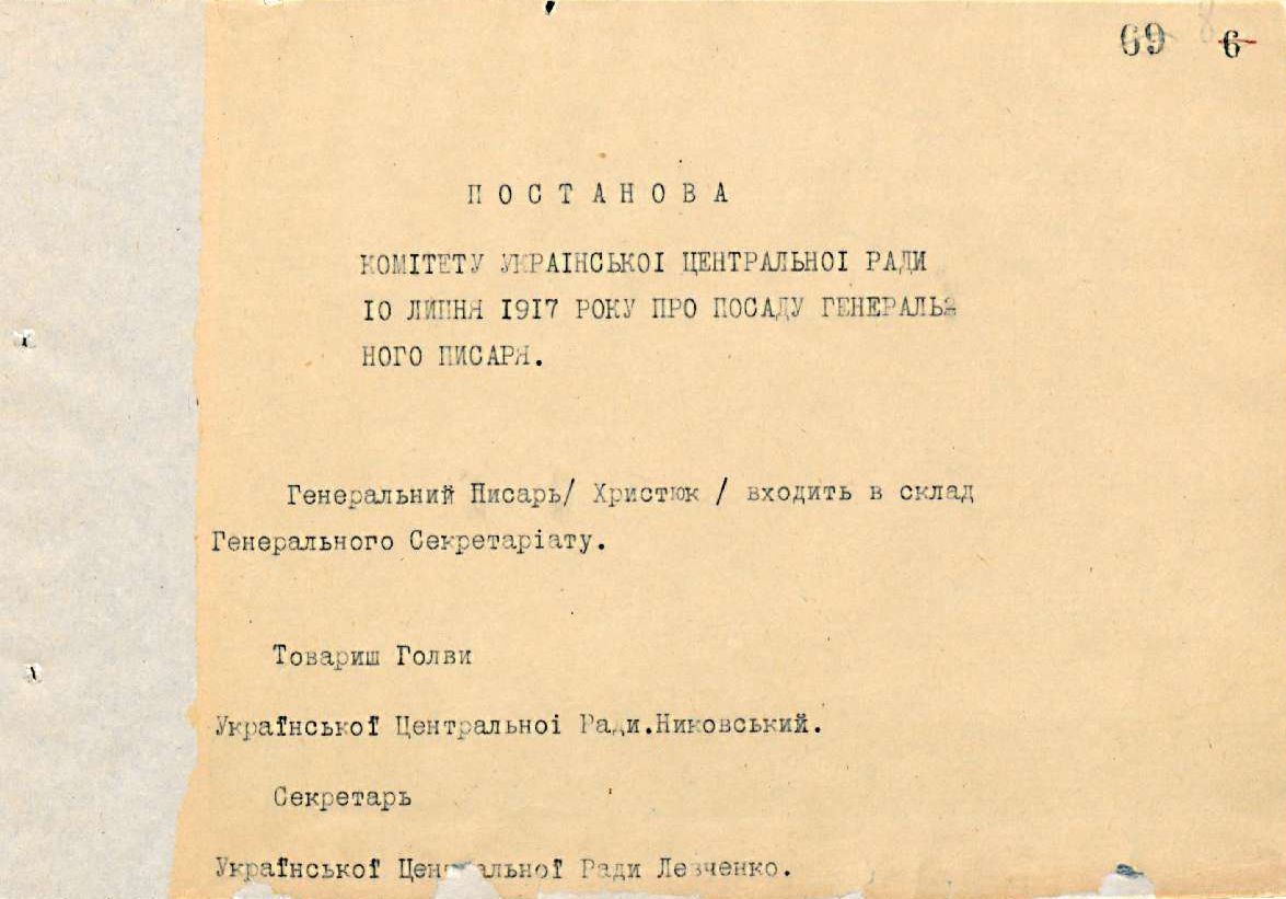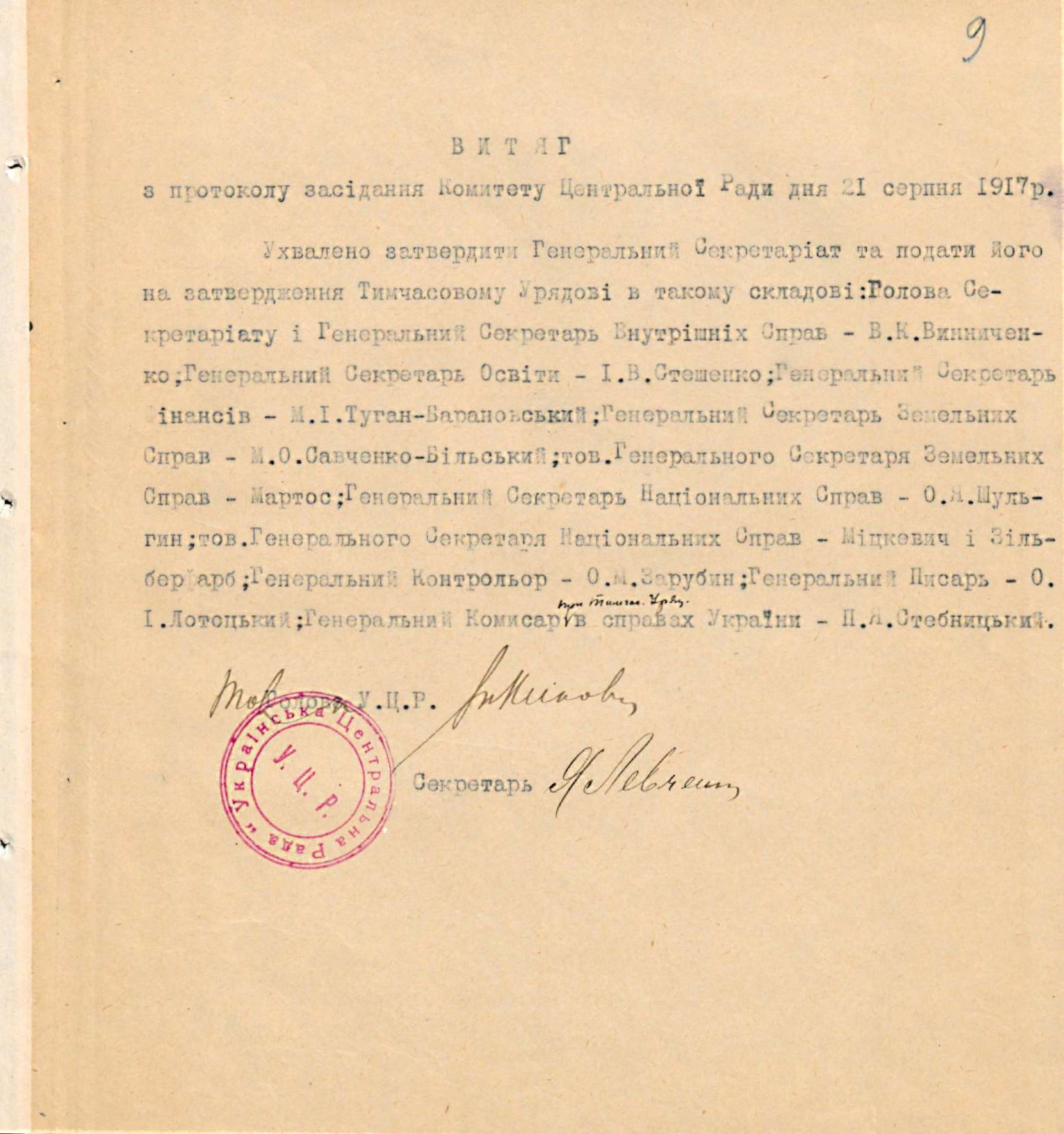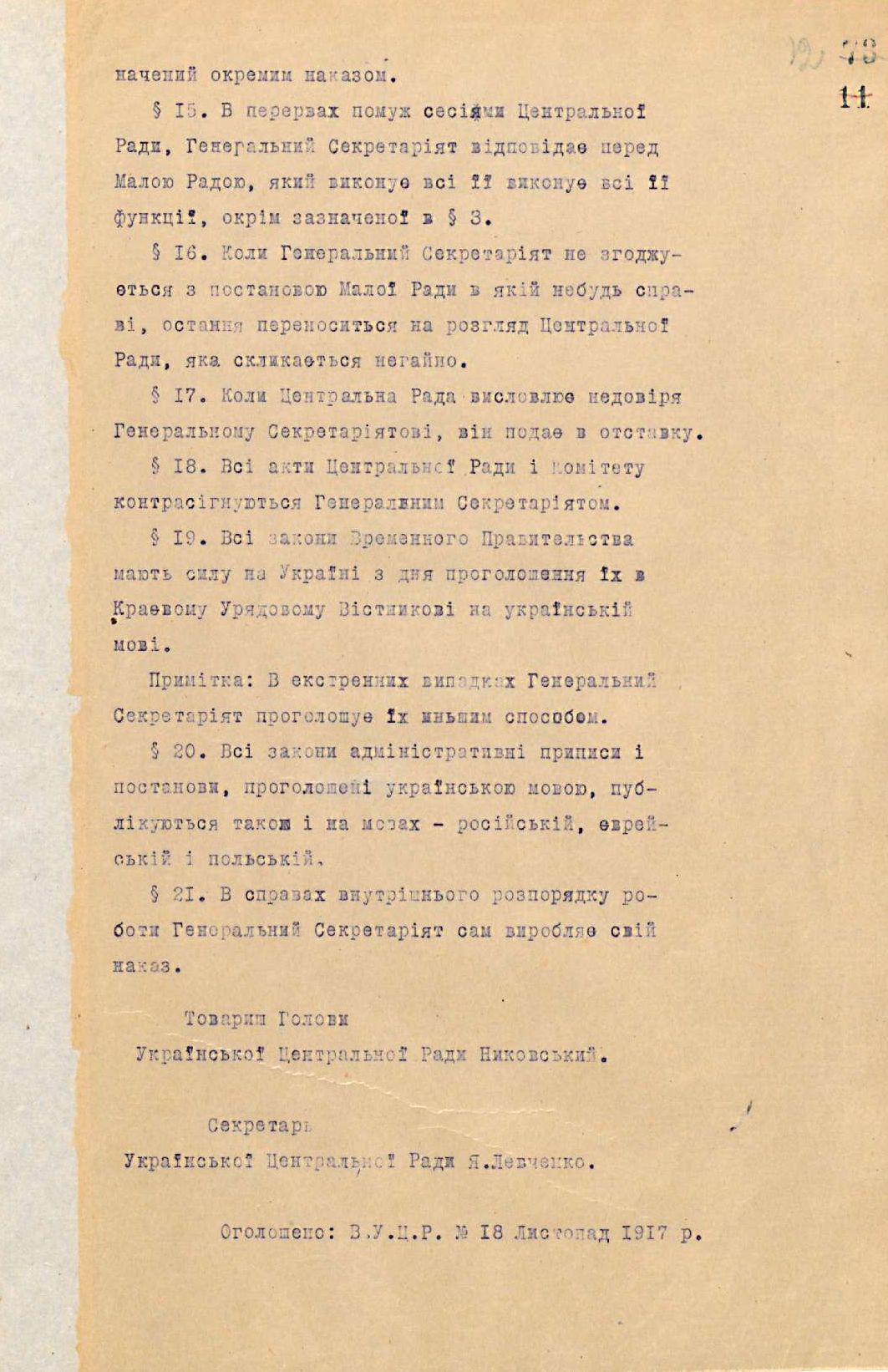 1. Другий універсал Української Центральної Ради. 3 липня 1917р. 2. Другий універсал Української Центральної Ради. 3 липня 1917р. 3. Другий універсал Української Центральної Ради. 3 липня 1917р. 4. Постанова Комітету Української Центральної Ради про посаду Генерального писаря. 10 липня 1917р. 5. Постанова Комітету Української Центральної Ради про склад Генерального Секретаріату. 15 липня 1917р. 6. Постанова Української Центральної Ради про Статут Генерального Секретаріату. 16 липня 1917р. 7. Постанова Української Центральної Ради про Статут Генерального Секретаріату. 16 липня 1917р. 8. Постанова Української Центральної Ради про Статут Генерального Секретаріату. 16 липня 1917р. 9. Витяг з протоколу засідання Комітету Центральної Ради про склад Генерального Секретаріату. 21 серпня 1917р. 10. Третій універсал Української Центральної Ради. 7 листопада 1917р.