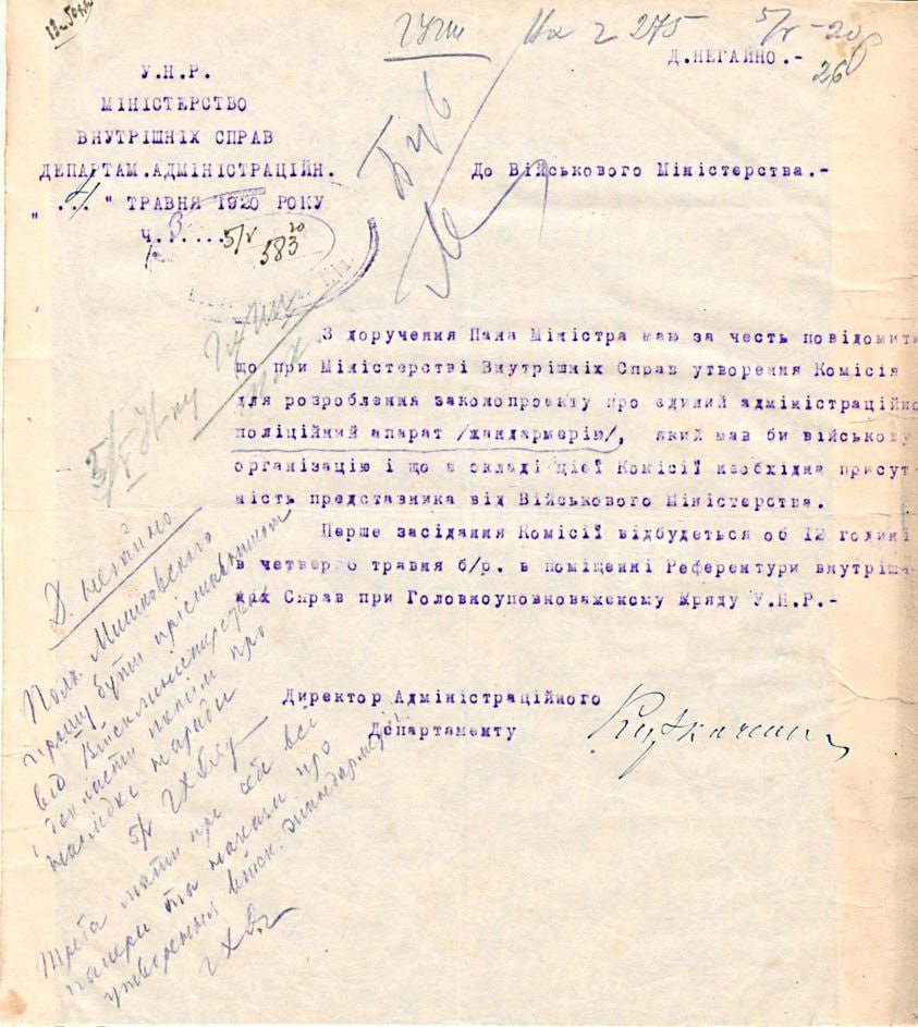 Лист Міністерства внутрішніх справ УНР до Міністерства військових справ УНР щодо створення комісії для розроблення законопроекту про єдиний адміністративно-поліцейський апарат (жандармерію). 4 травня 1920р.