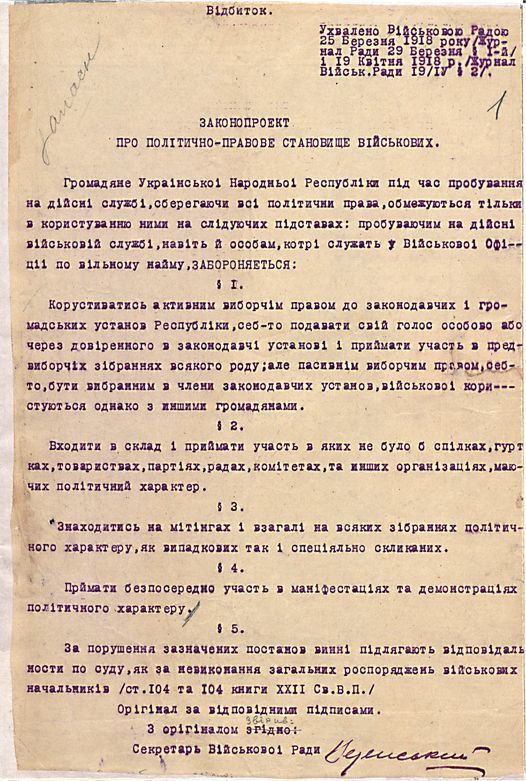Законопроєкт про політично-правове становище військових, ухвалений Військовою Радою 28 березня і 19 квітня 1918р.