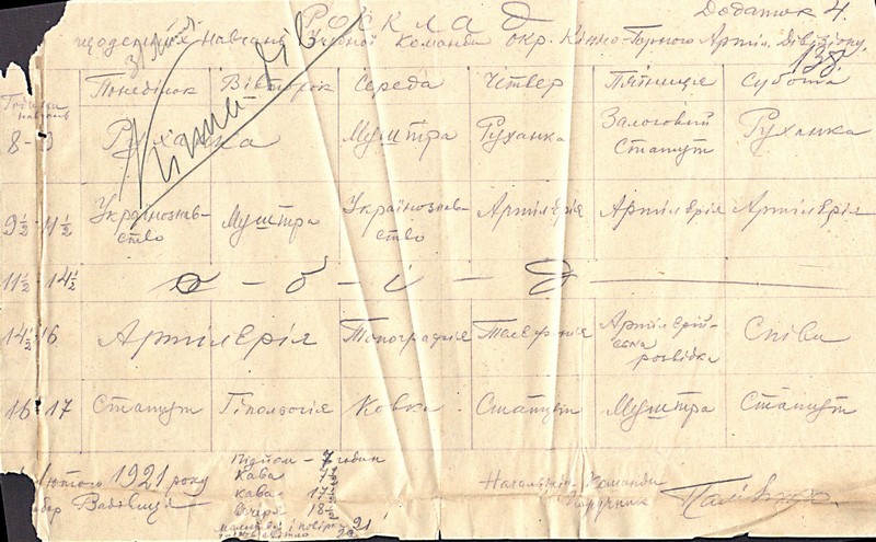 Розклад щоденних навчань учбової команди Окремого кінно-гірського артилерійського дивізіону. Лютий 1921р.