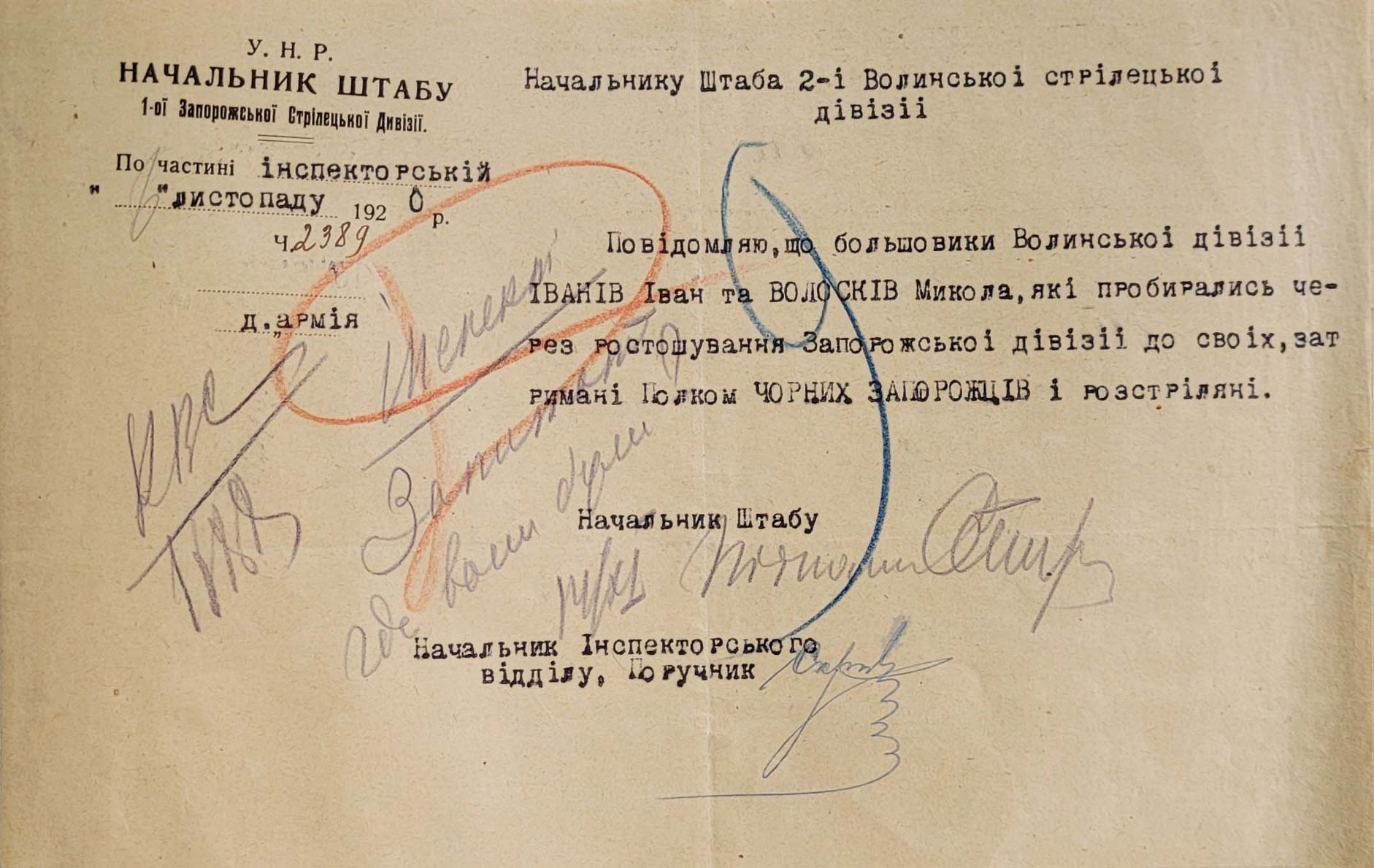 Повідомлення начальника штабу 1-ї Запорізької дивізії про розстріл більшовицьких агентів. 8 листопада 1920р.