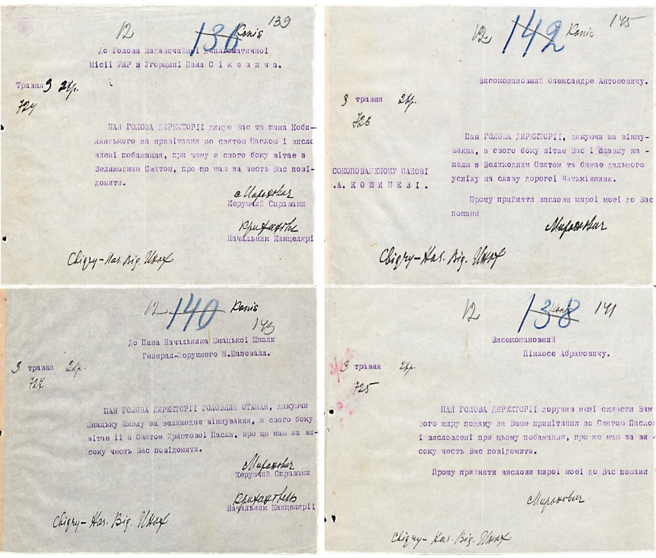 Листи Керуючого справами Директорії УНР В. Сікевичу, П. Красному, М. Шаповалу та О. Кошицю з подякою від Симона Петлюри за привітання з Великоднім Святом. 3 травня 1921р.