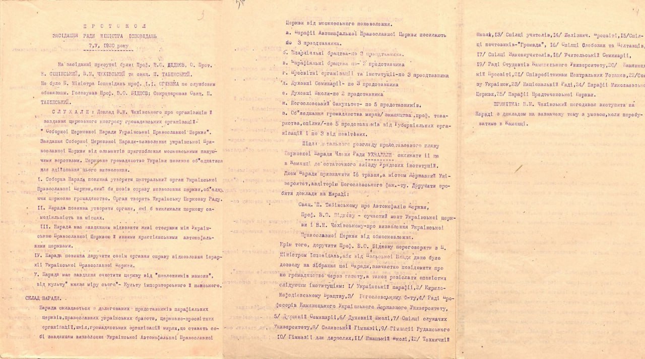 "Завдання Соборної Церковної Наради — визволення української Православної Церкви від елементів пригноблення московськими пануючими верствами. Церковне громадянство України повинно об'єднатися для здійснення цього визволення... Нарада має завдання очистити церкву від "поклонників момони", від культу "князя міру сього"... З протоколу засідання Ради Міністра Ісповідань УНР. 7 травня 1920р.
