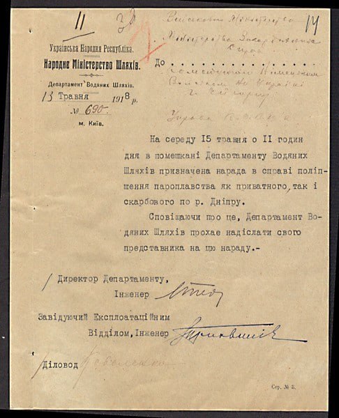 Лист Департаменту водних шляхів Міністерства шляхів про нараду в справі поліпшення пароплавства по р. Дніпро. 13 травня 1918р.