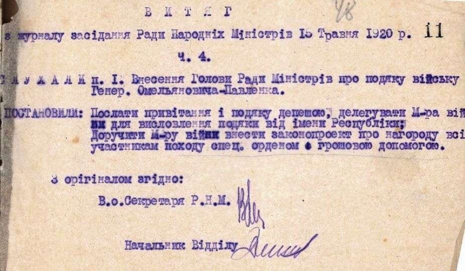 Витяг з журналу засідання Ради Народних Міністрів УНР про подяку війську під командуванням М. Омеляновича-Павленка. 15 травня 1920р.