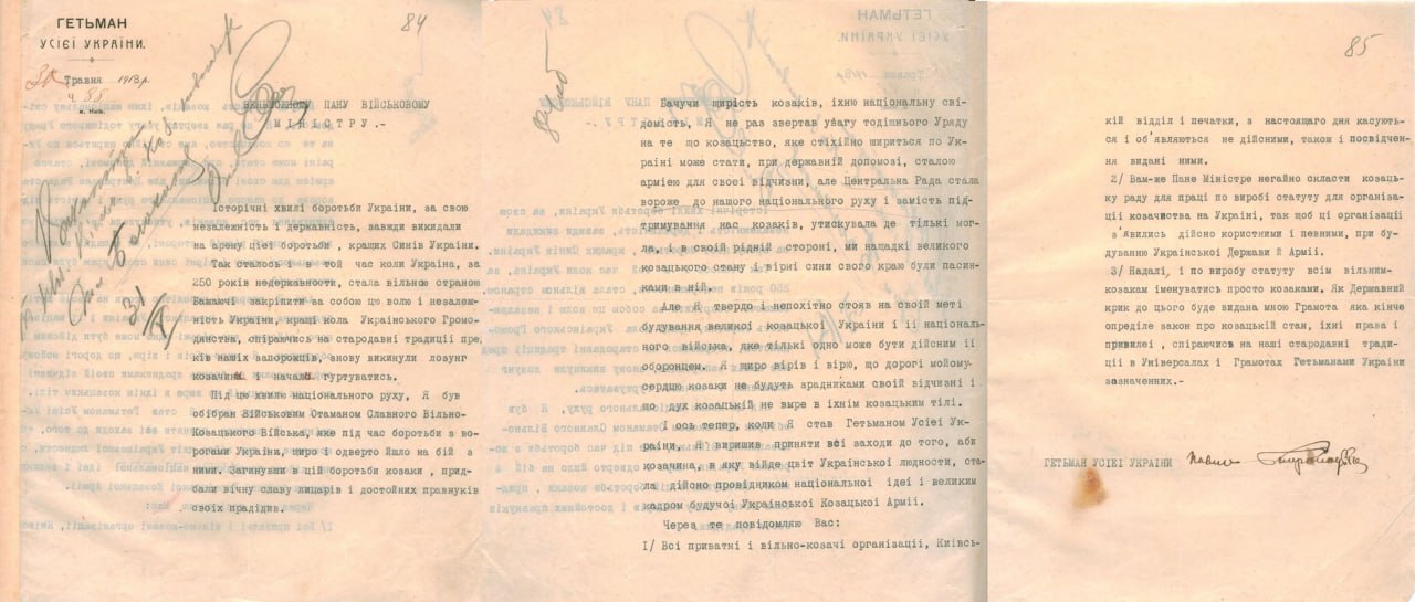 Лист Гетьмана П. Скоропадського до Військового міністра Української Держави О. Рогози про організацію козацтва в Україні. 30 травня 1918р.