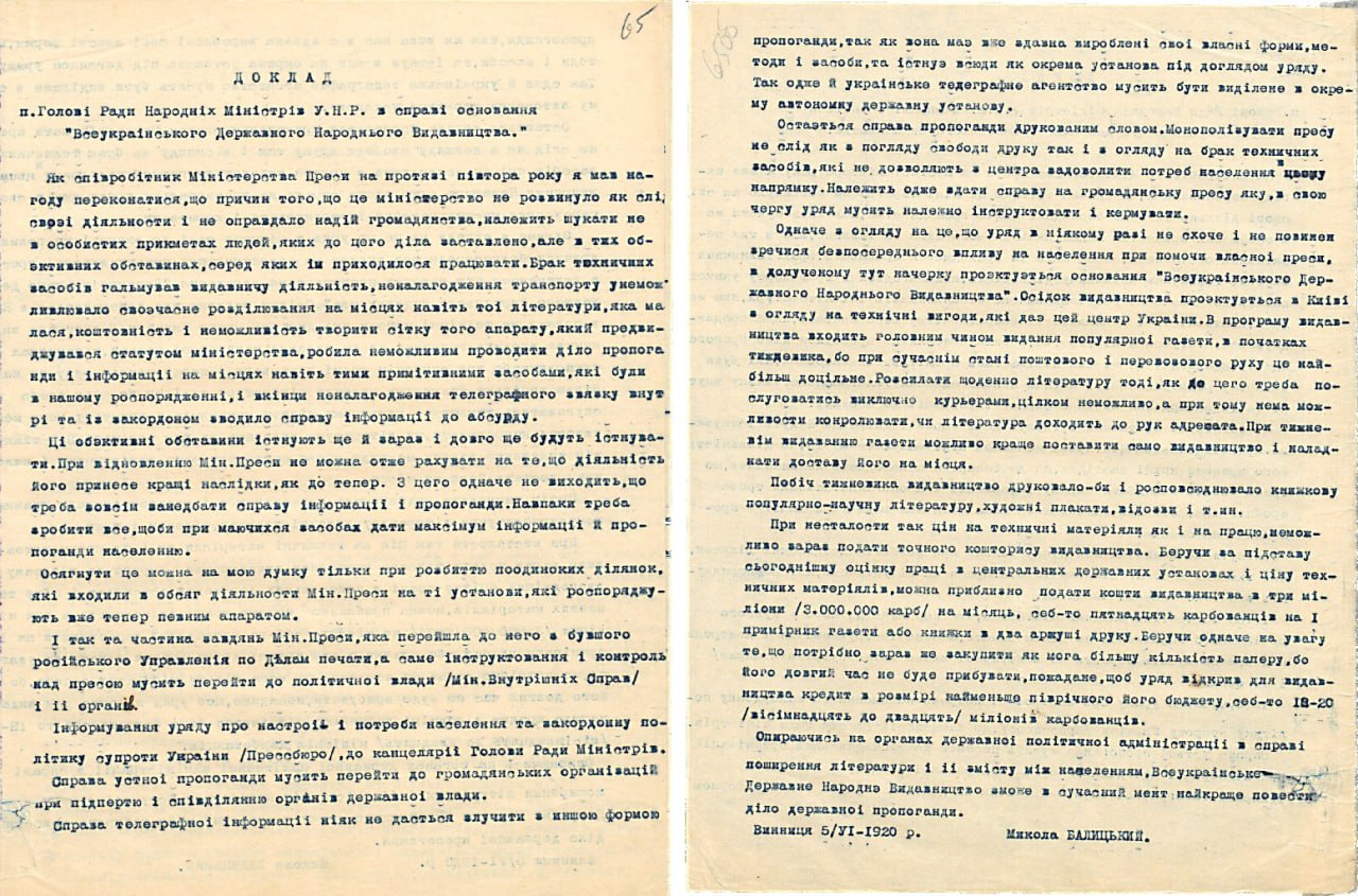 Доповідь співробітника Міністерства преси і пропаганди УНР М. Балицького Голові Ради Народних Міністрів УНР про створення «Всеукраїнського державного народного видавництва». 5 червня 1920р.
