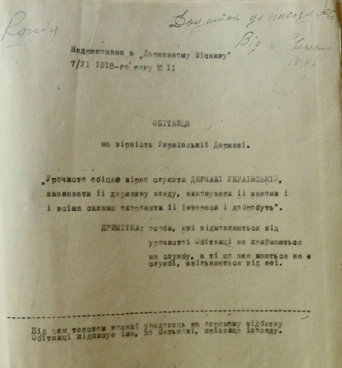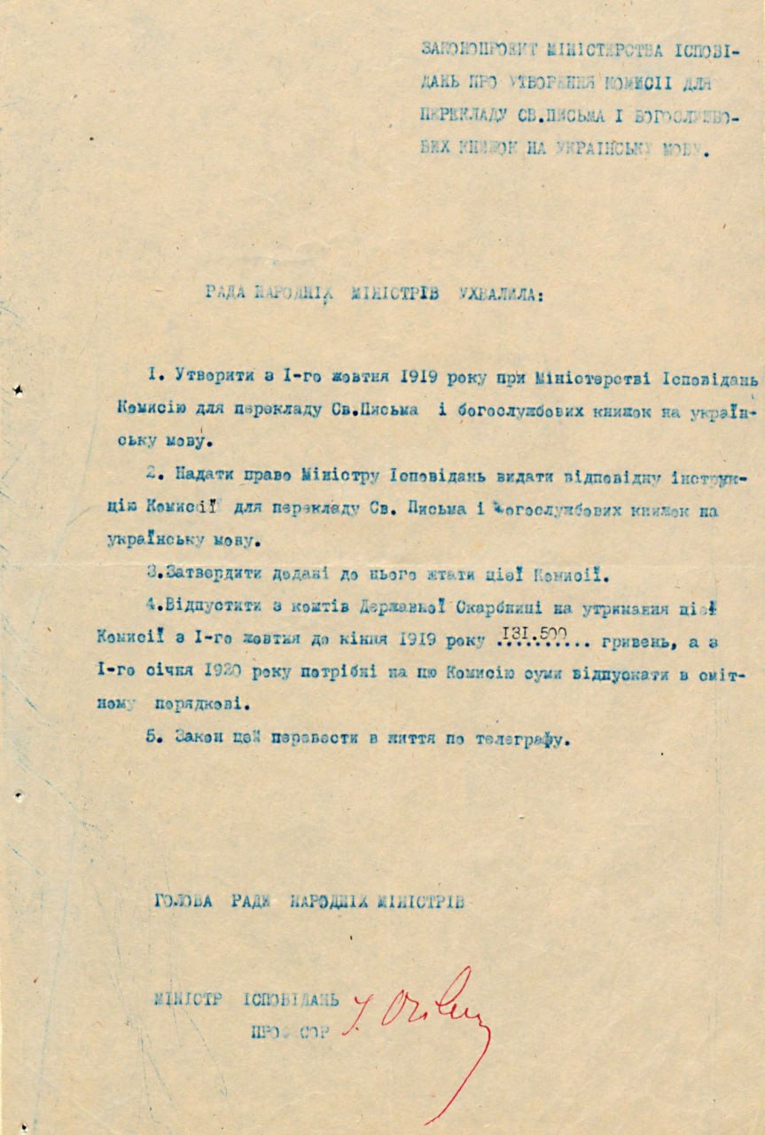 Законопроєкт Міністерства ісповідань УНР про утворення Комісії для перекладу Святого Письма і Богослужбових книжок на українську мову, підписаний І. Огієнком. Не пізніше жовтня 1919р.