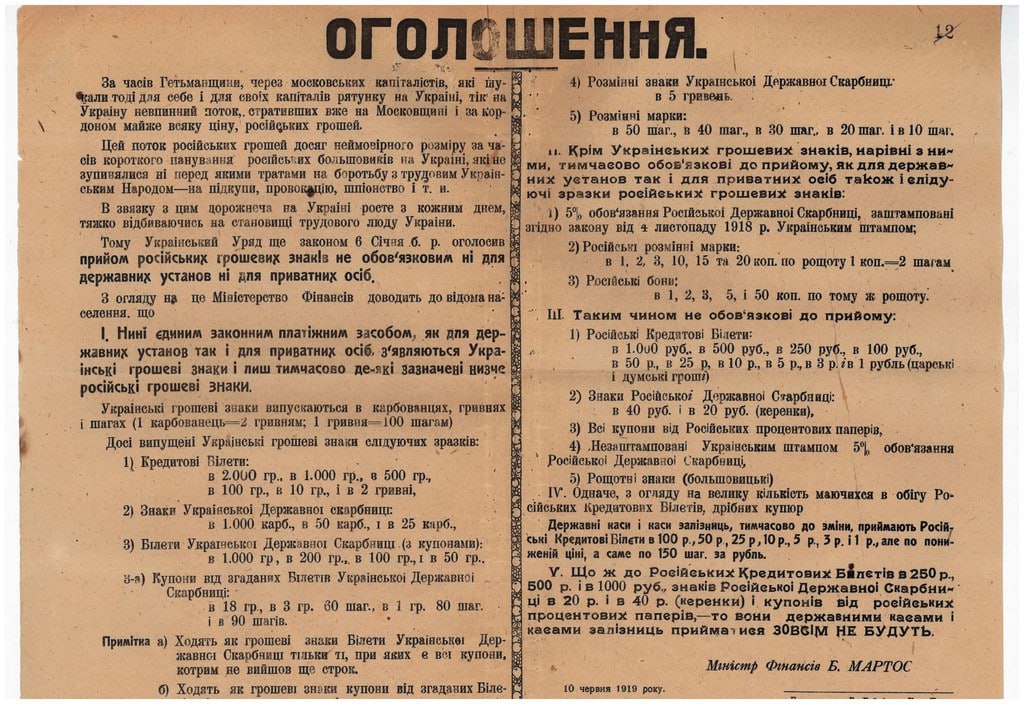 Оголошення Міністра фінансів УНР Б. Мартоса про негативні наслідки обігу російських грошей на території України та використання українських грошових знаків. 10 червня 1919р.
