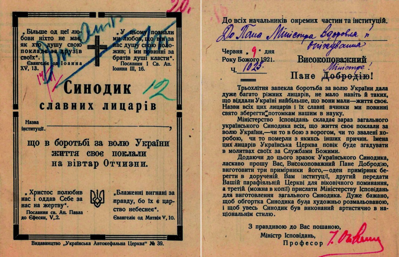 Лист Міністра ісповідань УНР І. Огієнка Міністру здоров’я і опікування УНР про складання загального Синодика українських лицарів для згадування їх у молитвах. 9 червня 1921р.