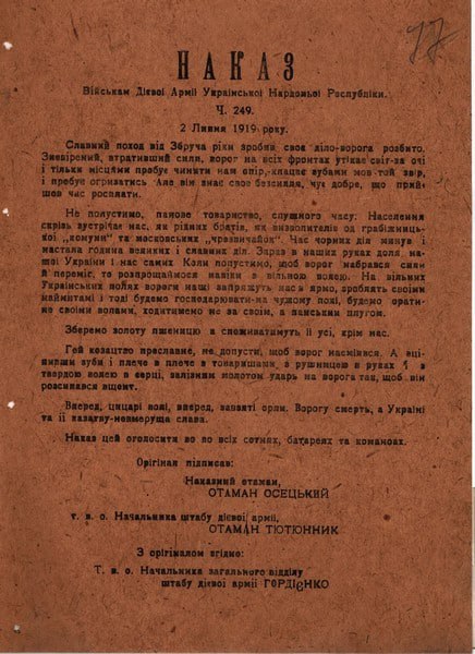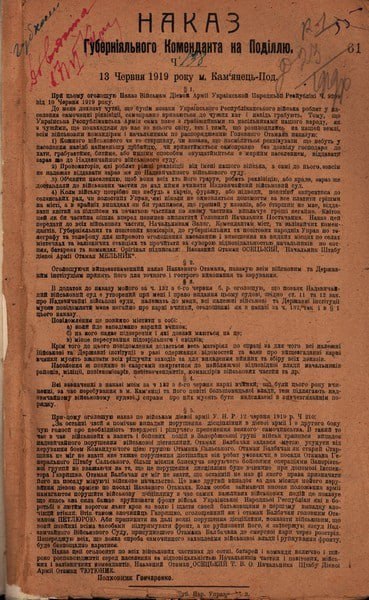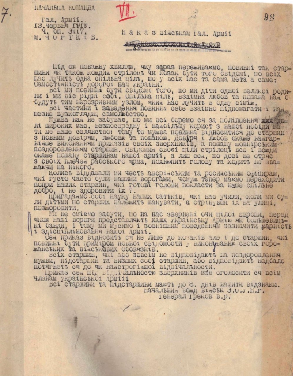 Наказ Начальної команди Української Галицької армії про повагу та дисципліну в армії. 13 червня 1919р.