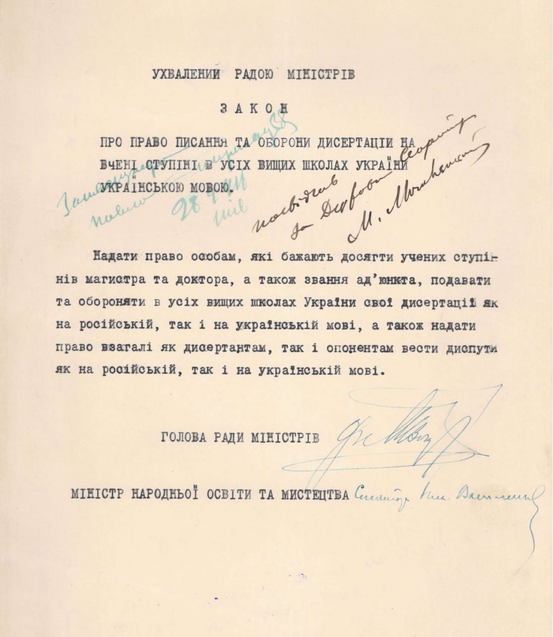 Закон Української Держави про право писання та оборони дисертацій на вчені ступені в усіх вищих школах України українською мовою. 28 вересня 1918р.